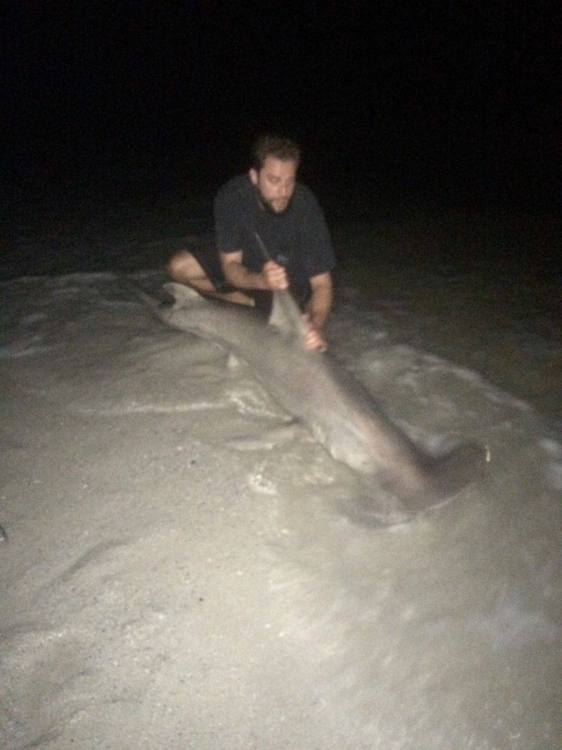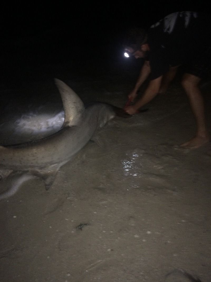 Fish finaly made it to shore. We were worried about the lower tide, but she didn't spit the hook. I grabbed the leader and tail and we had it up on the beach. We had the fish back in within a minute and with a little assistance, she swam off decently. Length 8' 10"