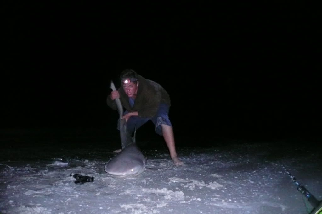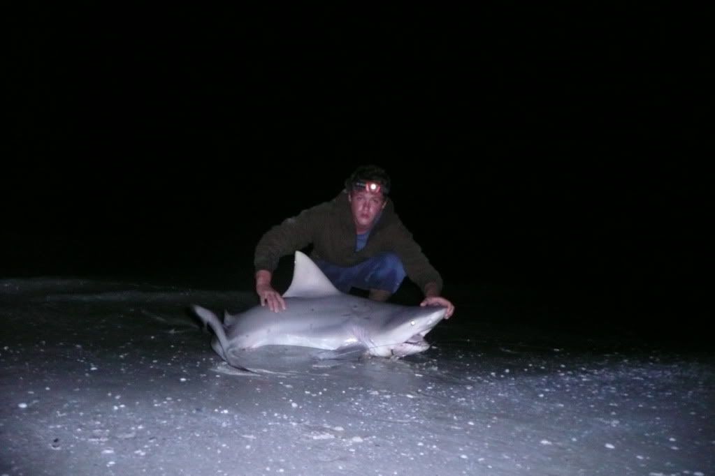 No sharks bit but we got a good collection of bait so we decided to go eat dinner and head down to the beach. As the night rolled on everyone was really tired so they went back to the house to sleep, I felt tired but i really wanted to catch a shark so i pulled thruough. after missing a ouple of sharks it gave me some hope to stay through the night so i slept on a beach chair and was later awoken by my avet rolling with a ten pound chunk of stingray on it. I let the shark eat and hit him with the running man, I didnt even know the shark was on for most of the fight and in the middle of the fight id stop reeeling and feel the line to feel a little bump, so i knew it was something . he didnt pull any drag, i just kind of reeled him in, ended up being a 6 foot bull.