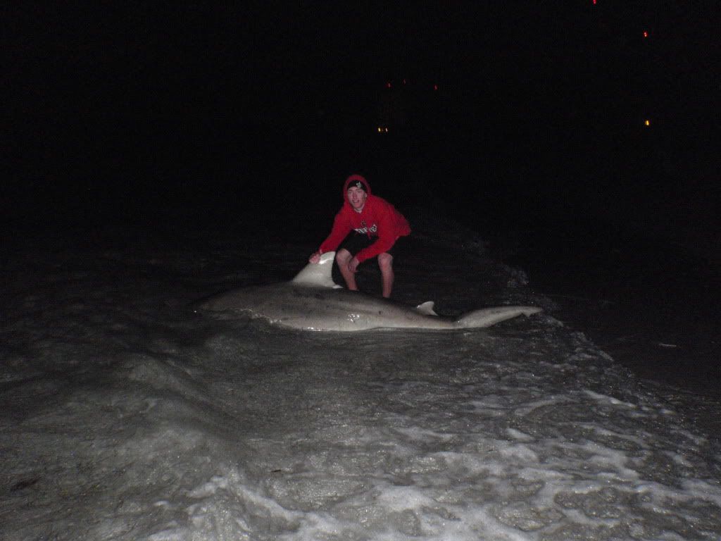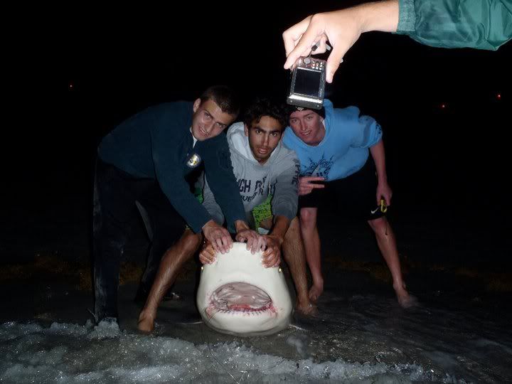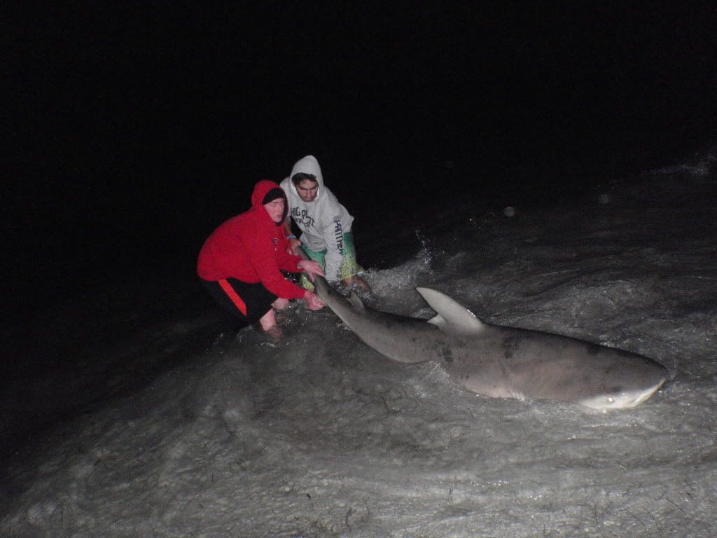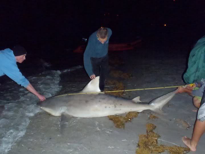 Its now 1230 as my feet touch the sand, and as they do the 16/0 starts screaming. Steven and i make a mad dash to the rod, passing zack as he is napping in his whole. The run stops after about 25 seconds of running. We bring the line tight cuz it got really slack and went to base camp to talk and eat. 10 minutes later the same rod goes off. CLAAAAAAAAAAACK. but its not stopping, we know we got him this time. Steve does the drag as im about to do the running man, READY! GO!!!!! i mush my ass up the sand and as i do BAM! i bust my ass. I get back up and keep running and setting running and setting. I handed the rod to steve after that showing i did so he could reel the fish in. However we had no runs, no head shakes, just weight was all we were dragging in for the next probably 30 minutes. After many jokes about bringing in a big rocks and fat nurses, steve says he felt a head shake, by now the fish should only be about 30 yards out. We keep joking, "Man you got the great barrier reef". And after 5 more minutes we see a dorsal and a body, a very nice body. After No Runs, No nothing, steve finally drags up ANOTHE 9 foot BULL. We take pics, take measurements do all that stuff. I had OJ open the sharks mouth and saw what probably led to the sharks fight. It was Gut Hooked. the stomach was in its mouth. I guess he just downed that full bonita on its first run and on its second run, when i set the hook, it was already down its throat. We spent a good 20 minutes reviving him, every now and then feeling a head shake or take push. Eventually we gave him a nice Big push and he slowely disappeared.