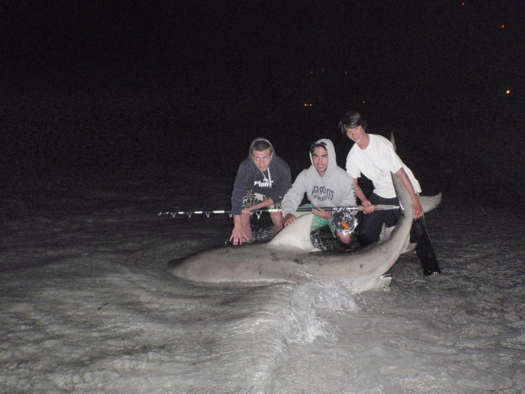 I was done for the night i thought, i came, i helped, they conquered, as im saying my goodbyes the 12/0 on a short rod goes off, screaming non stop, zack picked up the rod and set the hook and then passed it to a friend of ours . Needless to say i stayed around for a little bit, i took a video of the sharks first run and pictures of the angler. Due to the short rod and a fairly amateur shark fisherman fighting the fish, it took pretty long to bring this guy in. He didnt just run once or twice, bu ran atleast four times, the last two being only about ten yard runs but still. we thought we had a monster. After and hour in a half of fighting the fish our friend nick finally had his first BULL shark, a nice 8ft2 bull.