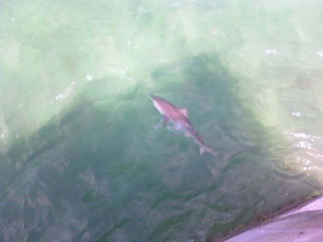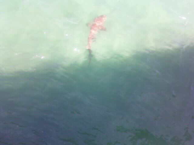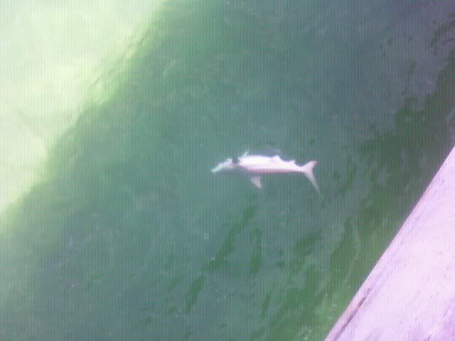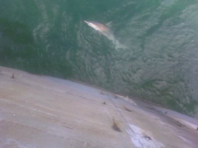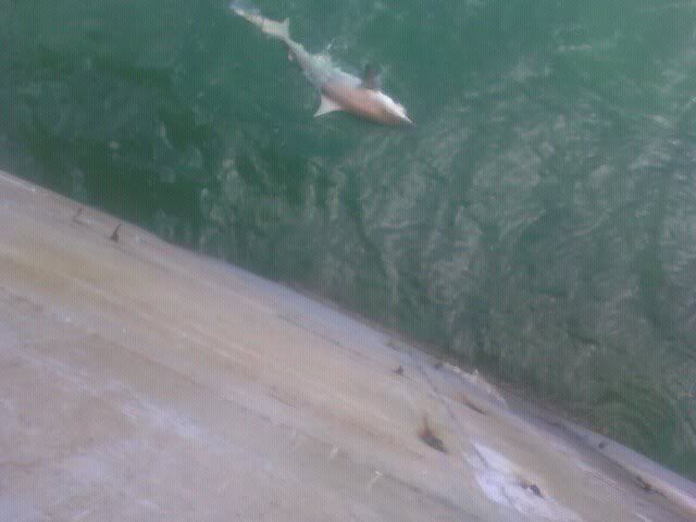 After gathering my snapper tackle from down the bridge, I see 2 or 3 sharks cruising on top, I cast a bait to it and he devours it: a blue runner on #7 wire and a 2/0 j hook