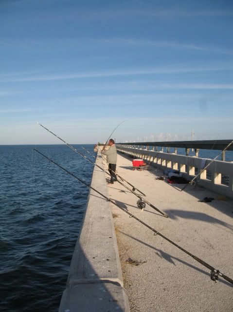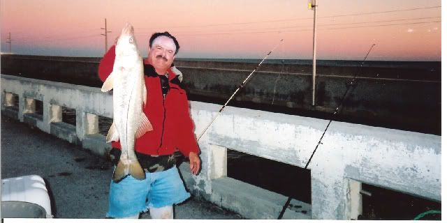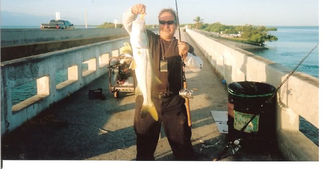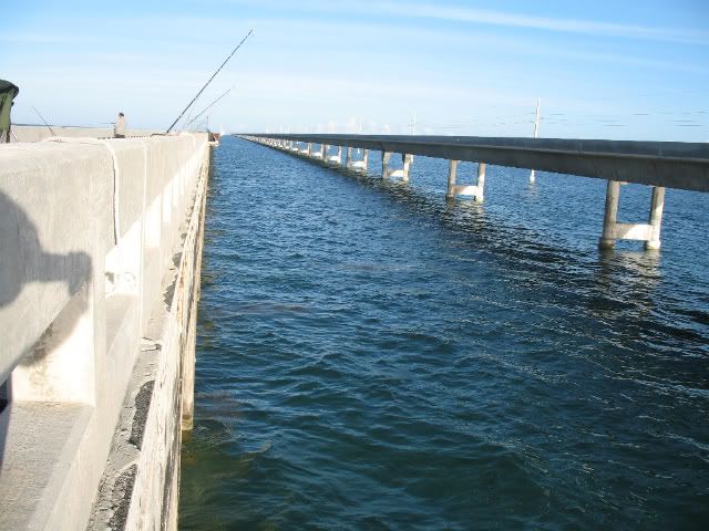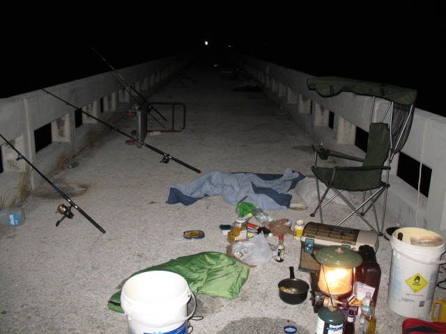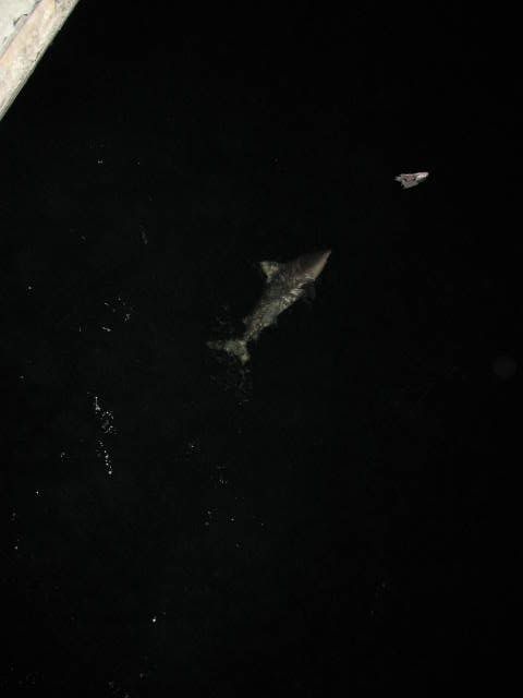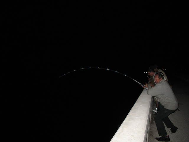 Well the holiday was fast approaching and it was going to be a short week,the weather was beautiful but a cold front was supposed to be moving in by Wednesday so we knew our window to fish before the cold front was small.Most of the guys of the South Florida Shark Club don't much worry about what time of the year it is, but rather look at the weather to determine if the bite is gonna be on or not.In the winter time we watch for spells in between the cold snaps that indicates a prime opputunity to get into the sharks.With that in mind we decided to meet at the bridge starting Monday afternoon when Jimbo would head down after work with son Jimmy and the young apprentice Aaron to fish Channel 2 and the seven mile bridge. The first night Jd and the boys fished ch 2 and they had no shark hits but caught some keeper eating fish. I was to head out monday afternoon but instead headed out Tuesday after work.Luis Iglesias left for channel 2 early Tuesday morning but the report from him was that some mackeral and yellow jacks was the only action he was getting on that bridge.Since Lui was going home before nightfall i decided to hook up with the Jimbo and the boys who were allready at the seven miler and fish till Wednesday afternoon with them.By the time i got out to the bridge the boys were into the fish having allready caught a 32 and half inch snook,two Goliath the biggest about 12 lbs,and assorted mix of jacks and small mangrove snappers.By the time i unloaded my gear from my cart the sun was heading for the horizion and i hurried and set up my snapper and shark rods.I put out my 14/0 with the only shark bait i had a frozen 2 lb yellow jack i took out of my freezer.I butterfied the 2 lb jack and balloned it away from the bridge into the Gulf.After setting out my shark rod i put out a small grunt on my Penn 750 spinner and caught a 17 inch mutton snapper while Jimmy and Aaron fished the pilings looking for that big mangrove snapper.Before sundown i pulled out the coleman stove and prepared to fix the guys a supper to lift there spirits because no sharks had taken a bait since the night before.As i was getting ready to start the stove i pulled out the video camera to film the beatiful sunset and the beautiful sight before us.I walked to Jimbo video camera in hand and asked for predictions on the shark bite that night and he said "snappers tonight- no sharks" i started laughing because i was more optimistic and less tired then he.Before i was able to put the video camera down the old throaty 14/0 takes off in a medium speed and i hand the video camera still on and recording the whole scene to Jimmy.The boys and i are now laughing out loud at Jd for his wrong prediction as i set up i felt the bait and not a shark so i set it back down and waited.Next up was Jimbo getting a hit on the 14/0 with Aarons newly wrapped 11 foot shark rod.As often happens before the sun was completely down the shark action got hot.Jimbo's bait was the carcass of a 5 lb yellow jack whose fillets i was gonna cook for dinner.So Jimbo sets up and it's going sideways and pulling some drag and Jd is working him like the pro he is ,,,,,back right ,then back left ,,,,it's a bull about seven feet Jimmy cries out.So then my 14/0 which still had bait on it gets a hit and it takes off the moment i set up,this shark is bigger and pulling more drag then Jimbo's ,,,so i had to go over Jimbo as my shark is heading left fast,and then i have to go back to the right and back over Jd whom allready has his bull shark straight down and soundly beaten.I continue to fight the shark and he is playing tug a war with me and i'm thinking another bull shark by the way he's fighting and soon he comes into view and again a bull shark bigger then the first and trying to swim under on me.So now we have double header bull sharks a male (mine) and a female his and we are both starting to realize we gotta walk down both bulls and get some nice pics of this rare double shot of bull shark,,,,probably mates we think.Jimbo gives the rod to Aaron who is more then willing to drag and coerce the bull the almost half mile to the end of the bridge.So we start our walk Aaron is allready 200 feet ahead of me easily leading the smaller female to the the seawall for pics and release.JD follows flashlight,measuring tape and wire cutters in hand as we head down to the end.My bull is an aggesive male bull that is stubborn to the max ,four or five times we have to stop and work back out to the right towards the end because my shark keeps on turning and swimming towards the channel as we approach the flats.I'm huffing and puffing and thinking i better lose the 15 lbs i need to soon before March and April of 2009 because if a less then 8 foot bull is doing me like this a big hammer will destroy me . Got to lose that weight and start doing more cardio in the gym,,,,wrong time of the year for dieting i'm thinking.Anyway we get down to the end and some friends are just arriving and lend us a hand with the two bulls so we take our pics, measure them both, release the two sharks and head back to see if we can finnaly eat our hot dinner before it gets too late.Jimbo who's been called in to work the following day leaves with his son Jimmy and Aaron and i stay the rest of the night on the bridge.That night we caught a few nice mangroves and the next morning we catch a few crevalles that we keep for next trip.Overall it was a good fishing trip spent with good friends.