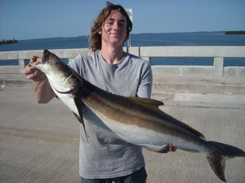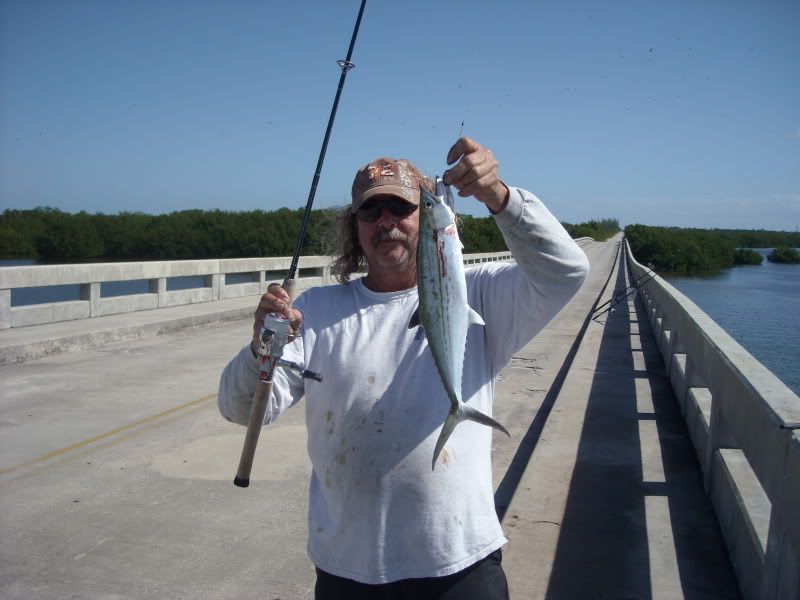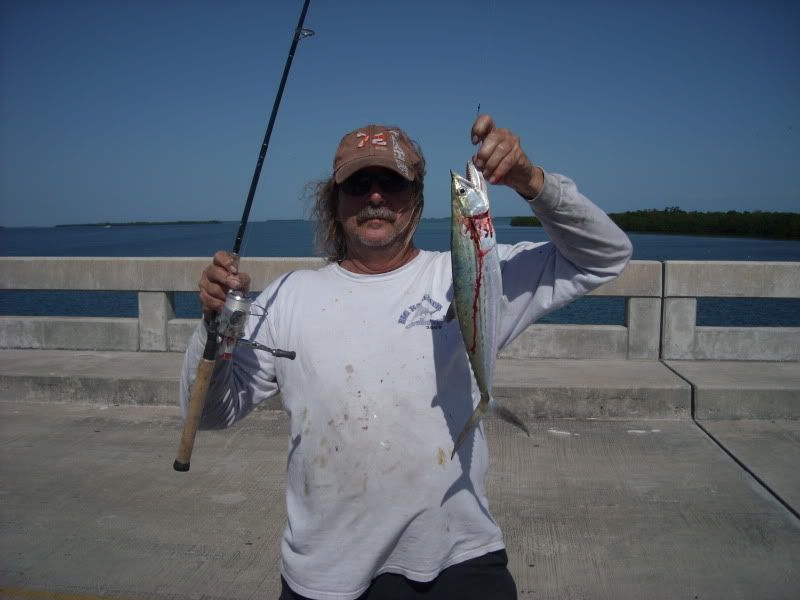 Saturday I got a call from JD Fagan. At the time I was working. After work I call him and set out to the Keys. We fished seven mile bridge South side. We put out shark baits on out going tide under the new bridge. I put mine stright down on the water. Two lemmons came in. We could see them by them Moon light. One took my bait on my 9;0 and the fight was on. A fter a short while I brought him up and we took picks with him stright down and released him. later we caught four nice mangroves. Got up in the morning and headed to old wooden with bait we caught at the boat ramp at seven mile bridge,sardines we also caught four jacks. At old wooden we chummed to catch macks and we chumed to catch tarpon with shark bait we had left over from seven mile. A six foot bull and some big tarpon came in for the chum. We had two pick ups from the tarpon but the shark would not take the bait. Later we chum sardines for macks I layed down. HAD NOTslep for two days. Hard core JD hook up on a cobia the fight was on. The fish had a another one behind it.I hook up on it and got pop off . As I was crying JD said gaff my fish and I did. A nice fifteen or twenty pounder. JD will Email the picks to Mark and Mark will put them on line .WE also CAUGHT FOUR NICE MACKS ![]()
