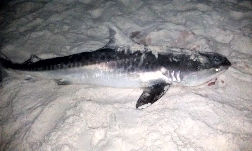 A foul hooked 7ft 5inch Spinner, hooked in the side fin.