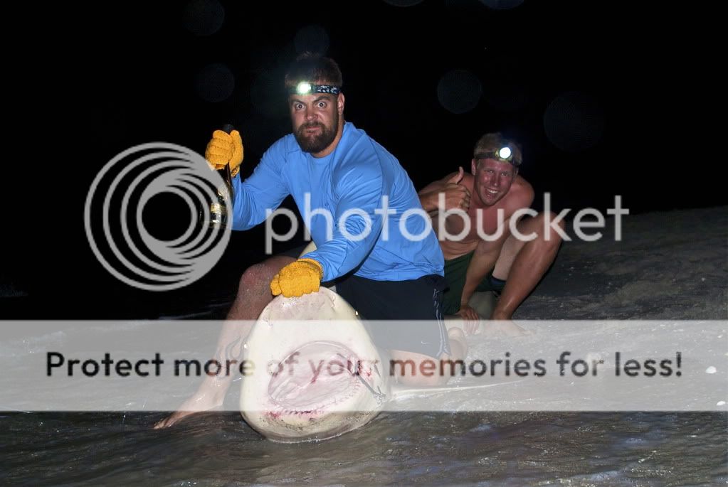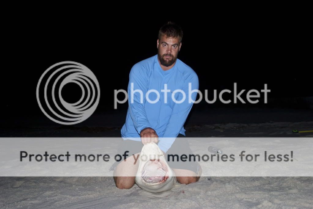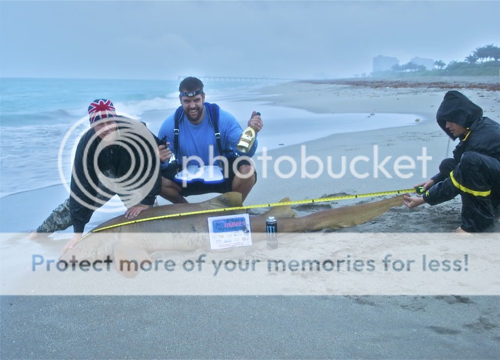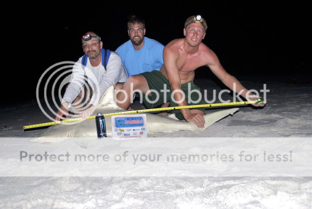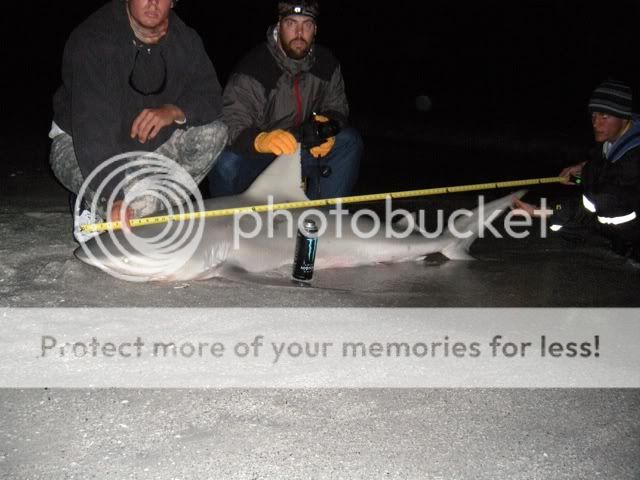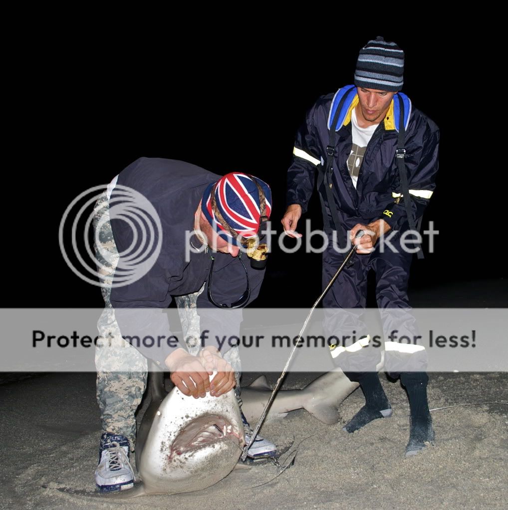 We meet up at 10pm and converge 4 cars of stuff into one truck. We hit our 1st destination and put baits out in the water. Unfortunately, it started to rain about 2 hrs into the trip. All of our clothing and sleeping stuff was soaked. We stuck it out. Near sunrise I hear a slow click of mattshark3198 reel going off. I don't move from under my umbrella because I assume he is adjusting his reel and I fall back to sleep. I wake up 5 min. latter and I hear the same noise. I turn and see that no one is around. I set the hook and play the fish for 5 min. I yell to the shark wrestler to find the guys and he sees them coming back from Mcdonalds with hot coffee and food. I hand the rod off to mattshark3198 and he fights the shark for 25 min. in the rain.