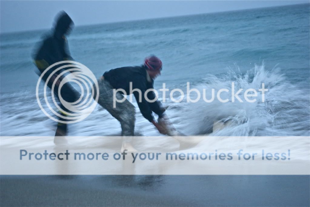 . I couldn't beleive it. We need that shark. It was the NURSE THAT BROKE THE CURSE. I turn to my left and shout for mattshark3198 to pose with the nurse and I see him standing there with an impressive bottle of champagne and another good luck piece. It was another unexpected site. The rain was severe and did put a hurting on my camera but I had to post the nurse and marcus wrestling in the surf.