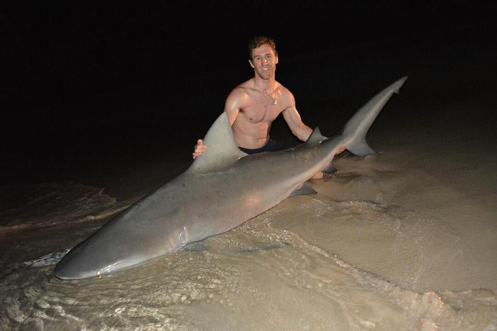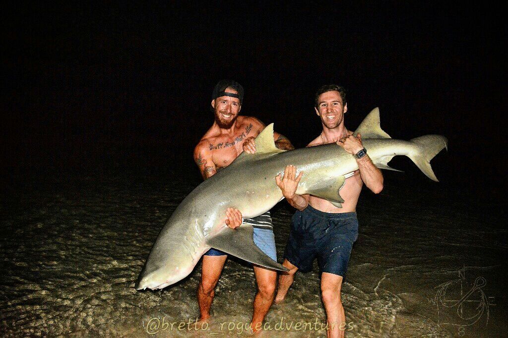 The next morning I got up early and deployed two new baits. It wasn’t too long before one got picked up. I let it have a heap of line before setting the hook with a running man. I came up really solid but no run. At this stage everyone else is still in bed. I give them all a rude awakening to come and give me a hand. The shark seems to be pretty heavy but doesn’t take much line if any really. I’m calling for an 8ft lemon or something but as I see this dark shadow making its way into the shallows I start to wonder what it is. Brett jumps in for a quick dip to wake him up and it’s about then when the shark is ready to be leadered. I hear Brett yell out “it’s not a bad shark man”…………“actually man it’s a pretty solid shark!” After a little resistance Brett beaches the shark and I un-harness and run down to help. I am pretty shocked at what I see. This is clearly my PB shark by a long way. She taped out at 12’ but disappointingly fought like she was only 7’! A few photos, a tag and off she went.