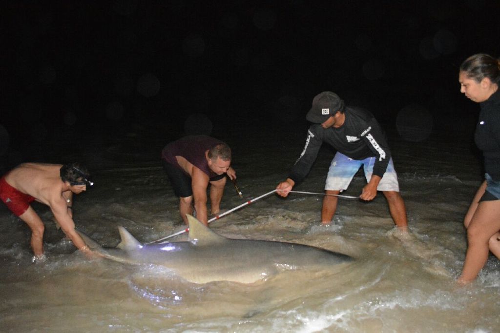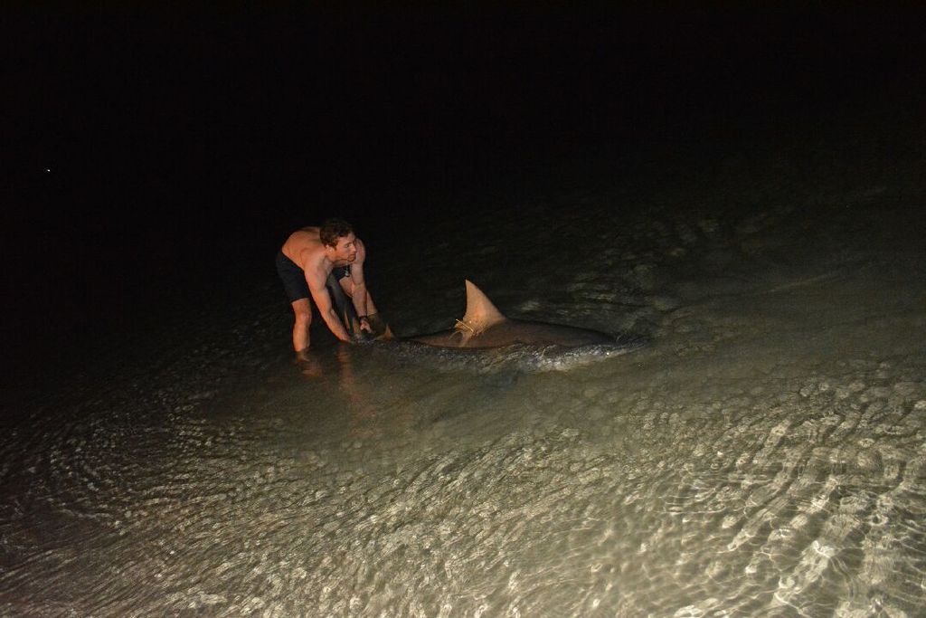 It wasn’t too much longer and my rod goes off on a nice steady run with a large half ray bait. I feel full weight when I attempt to set the hook but it then loosens off. I can feel that the bait is still there but the shark was gone. Annoyingly enough this same shark run and hook attempt occurred about half a dozen times until around midnight when the hooks finally set home and I was hooked up. The weight was solid but the drag barely clicked over a few times in the whole fight. Not long and I had a 9’ pigeye whaler on the sand.
