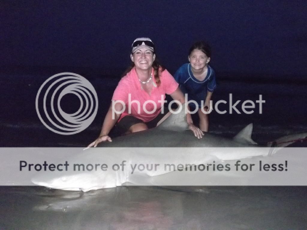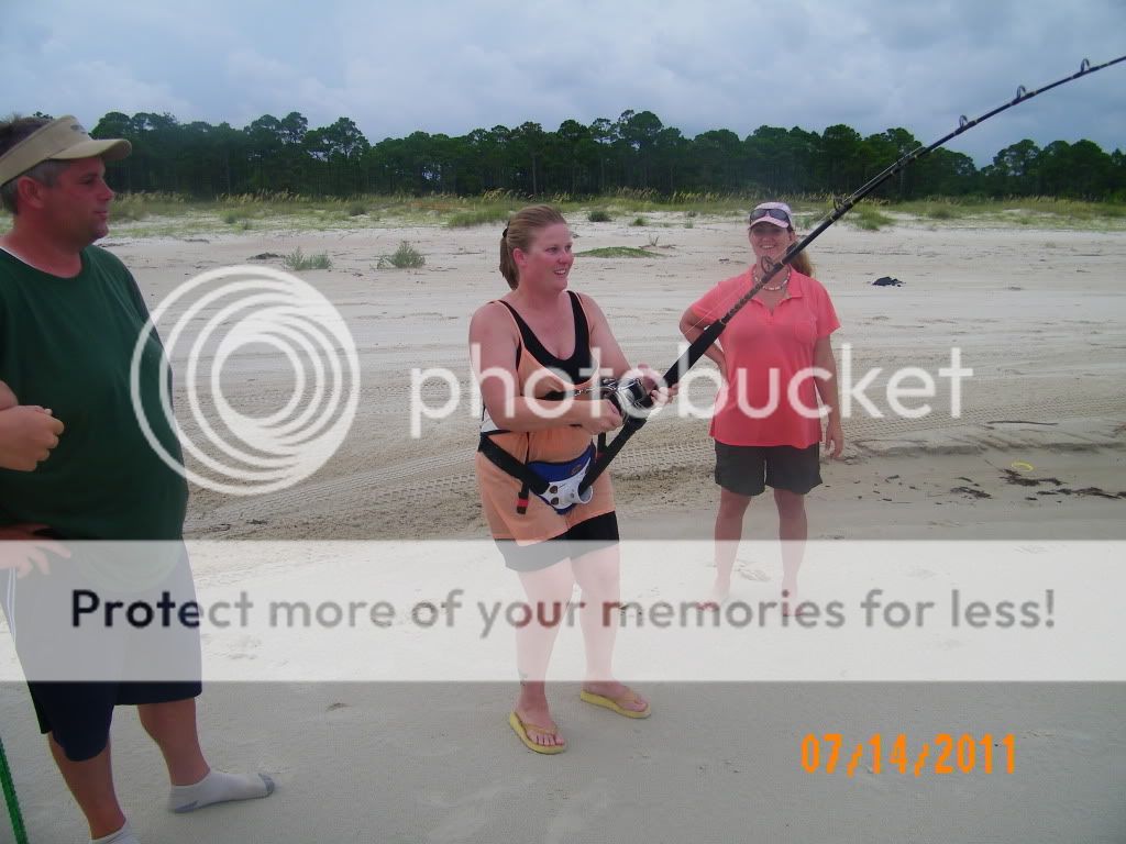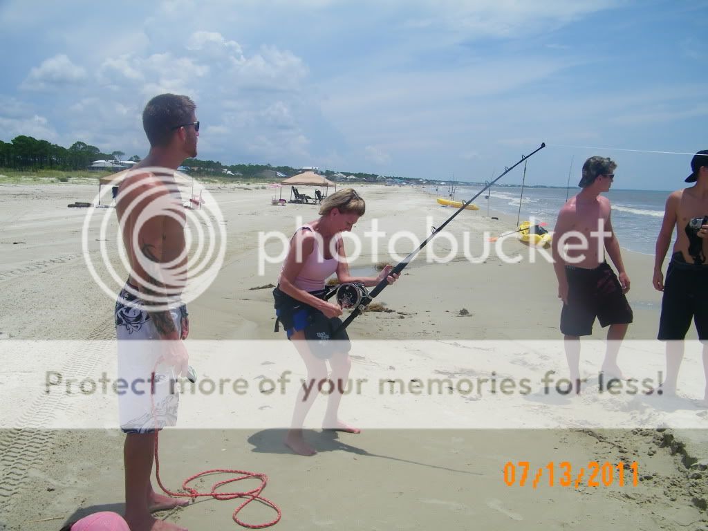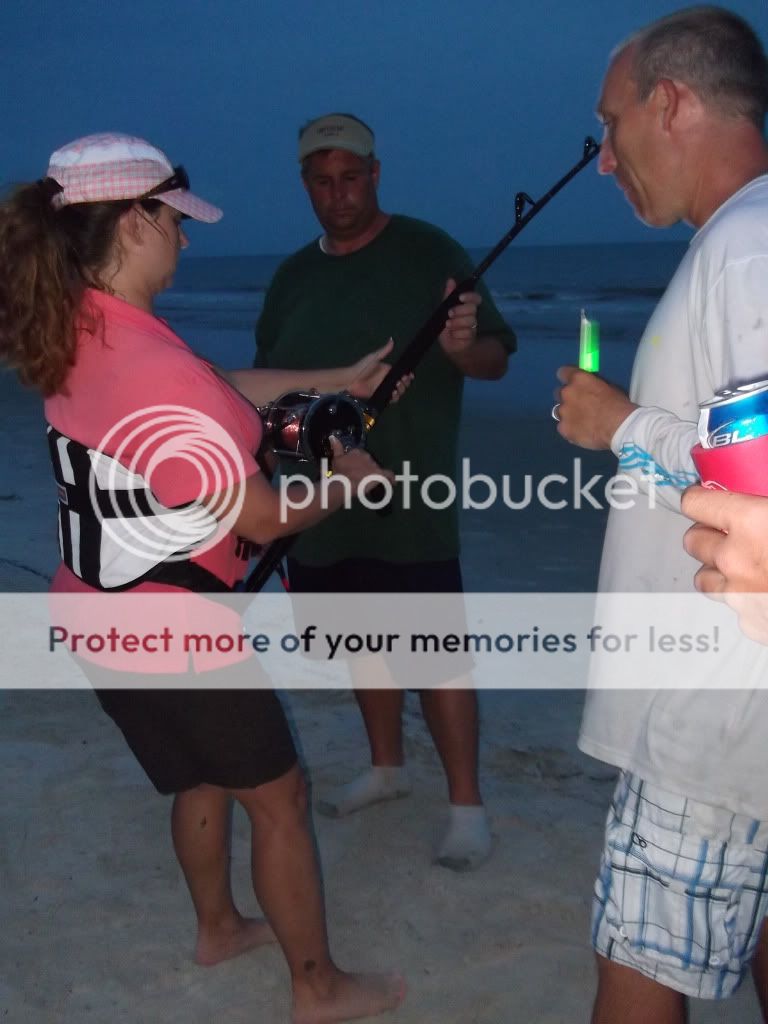 So around 5am we hear a rod go off jeffs mom and me where the the first on site, as we let the shark eat we call for shane. As he is getting straped up susan sets the hook and rolls the first run on her hip like a pro.