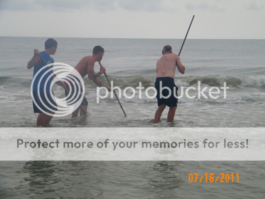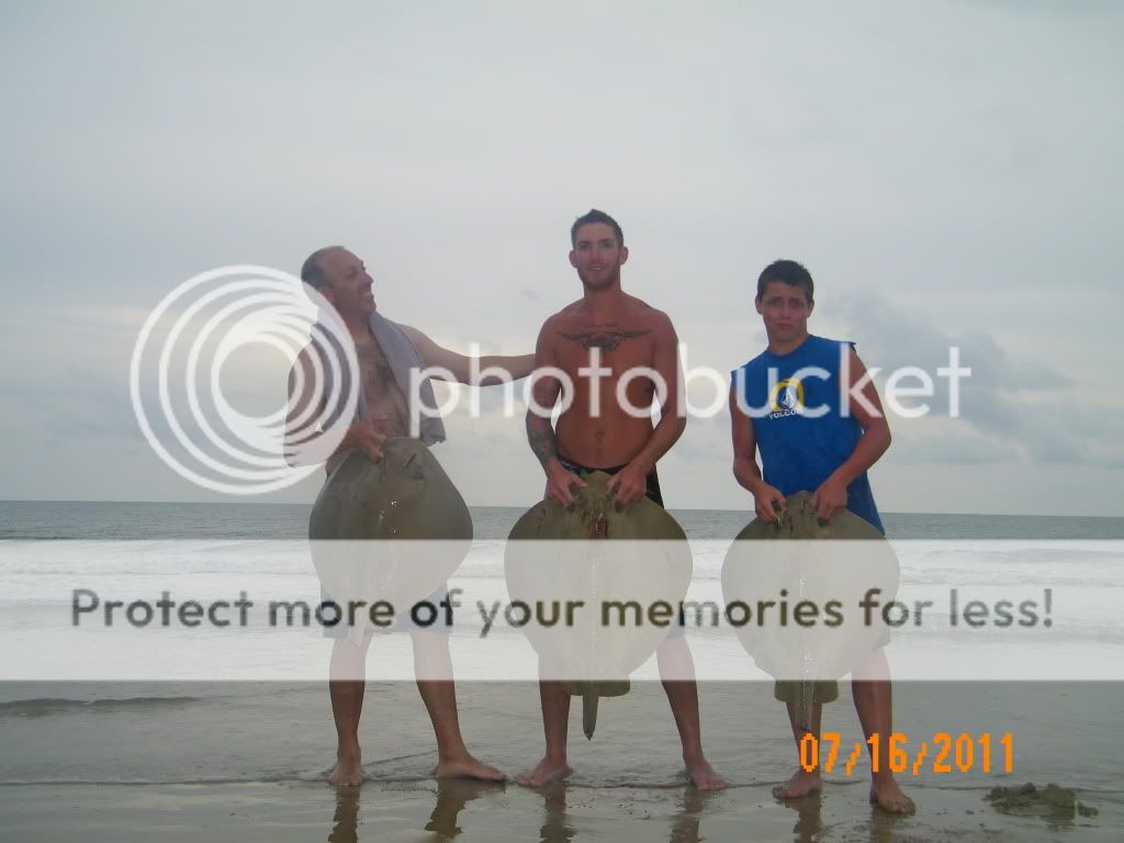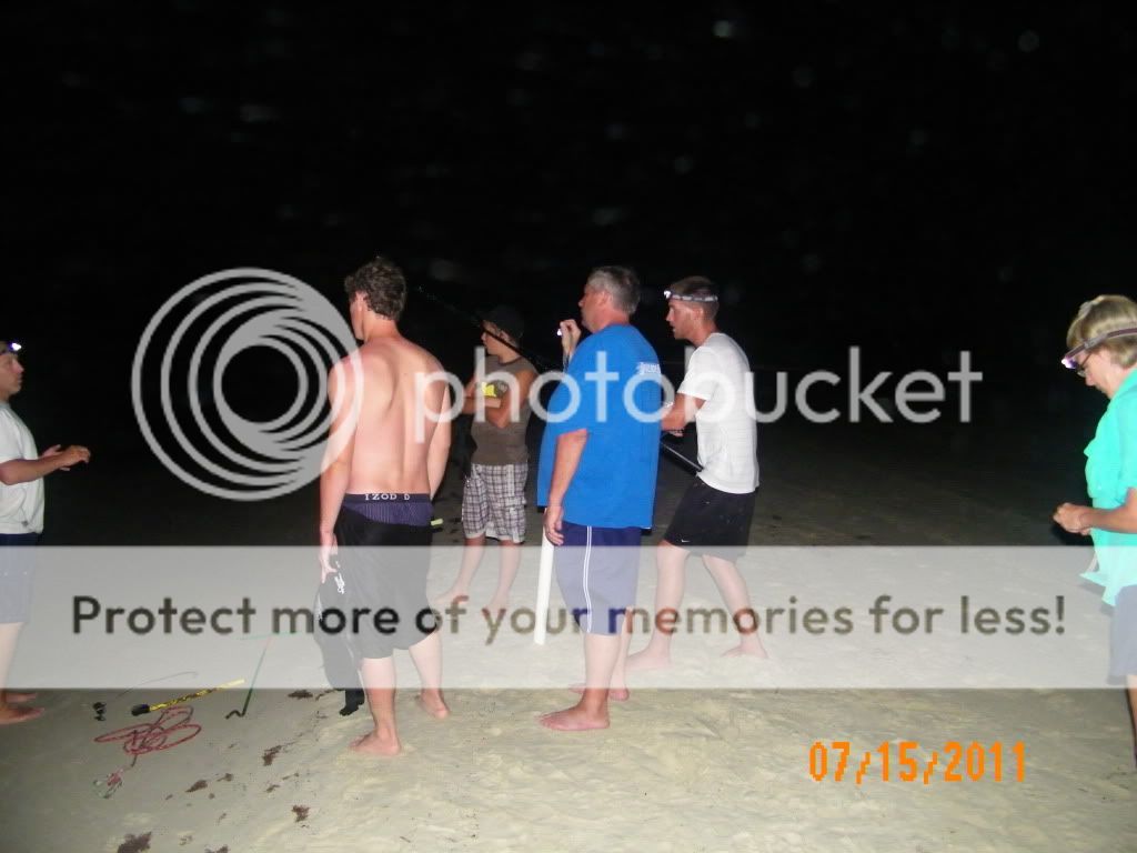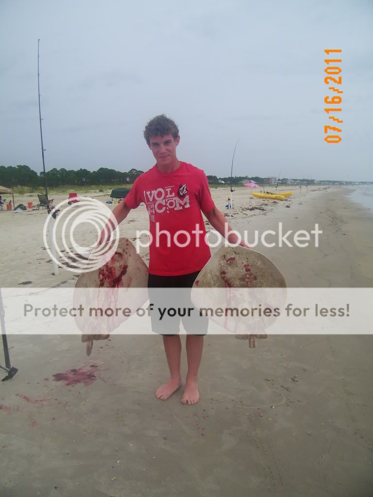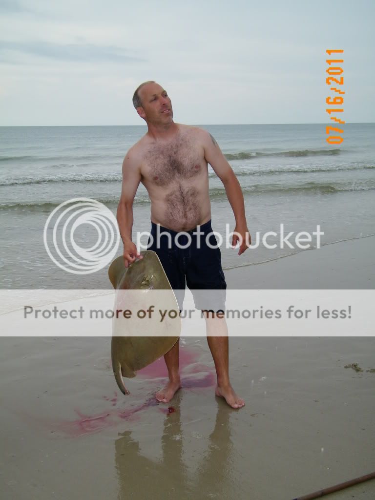 he jumps up grabs his mick dundee knife and gets a nice cownose ray. so now jeff and i return from the shack with a 150qt cooler of heads for bait. Jeff was walking in the surf for hours and he saw a carpet size ray, as he stabs it he breaks his gig.