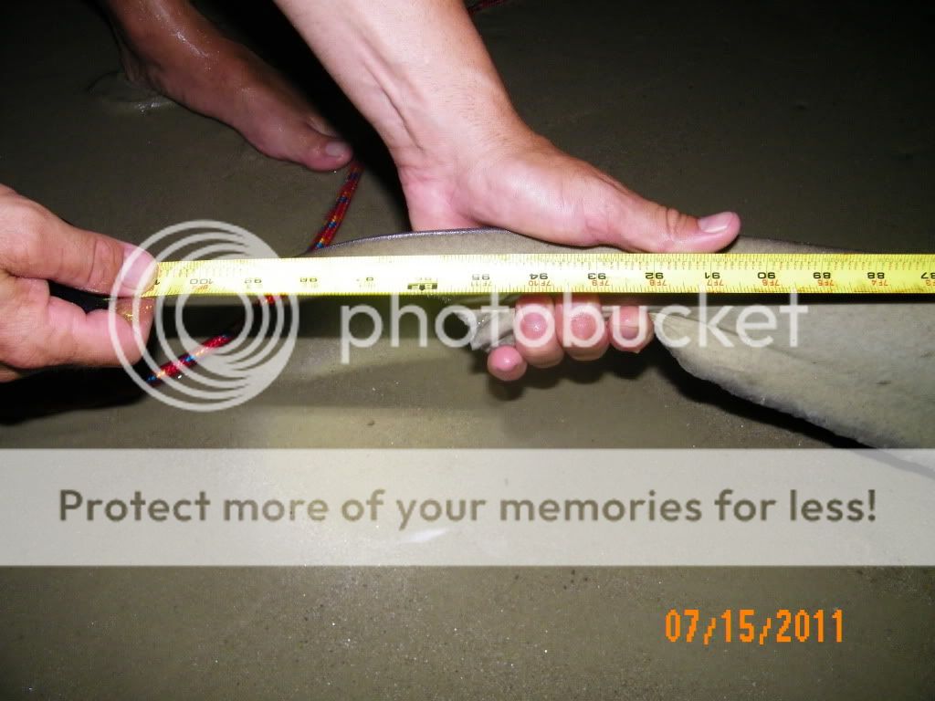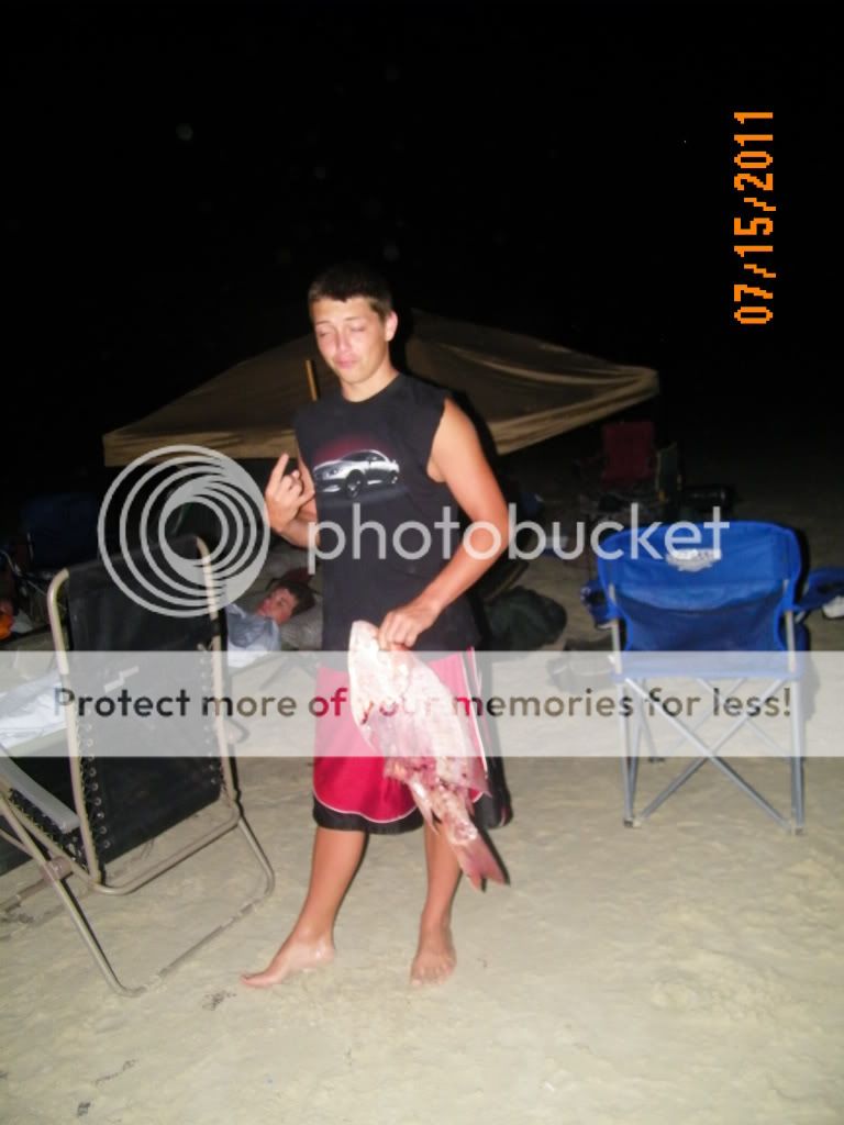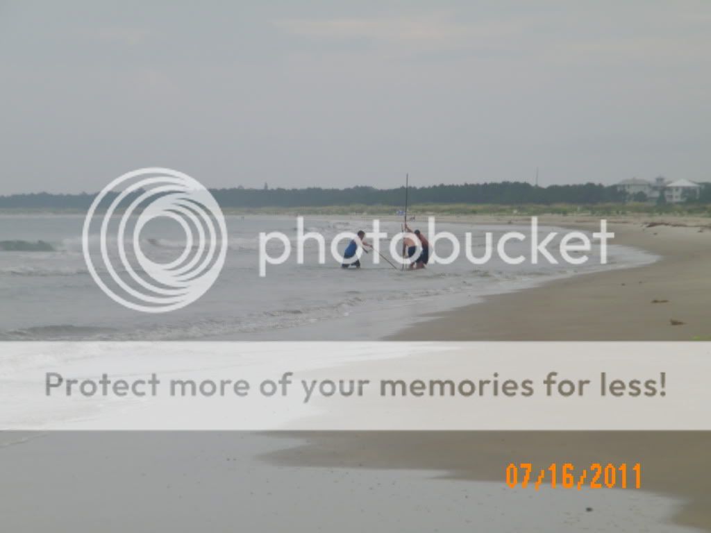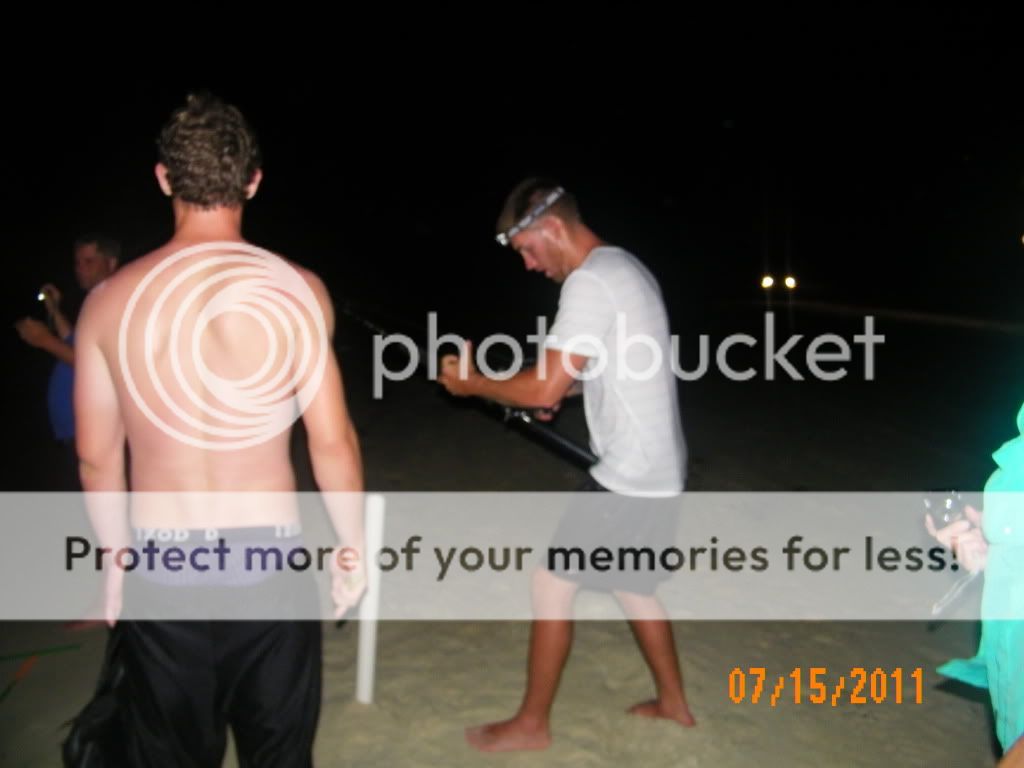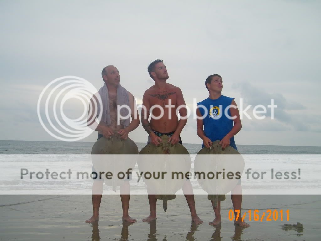 he jumps up grabs his mick dundee knife and gets a nice cownose ray. so now jeff and i return from the shack with a 150qt cooler of heads for bait. Jeff was walking in the surf for hours and he saw a carpet size ray, as he stabs it he breaks his gig.