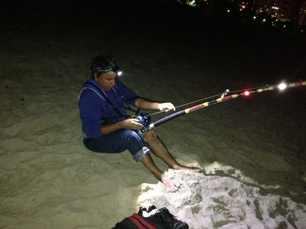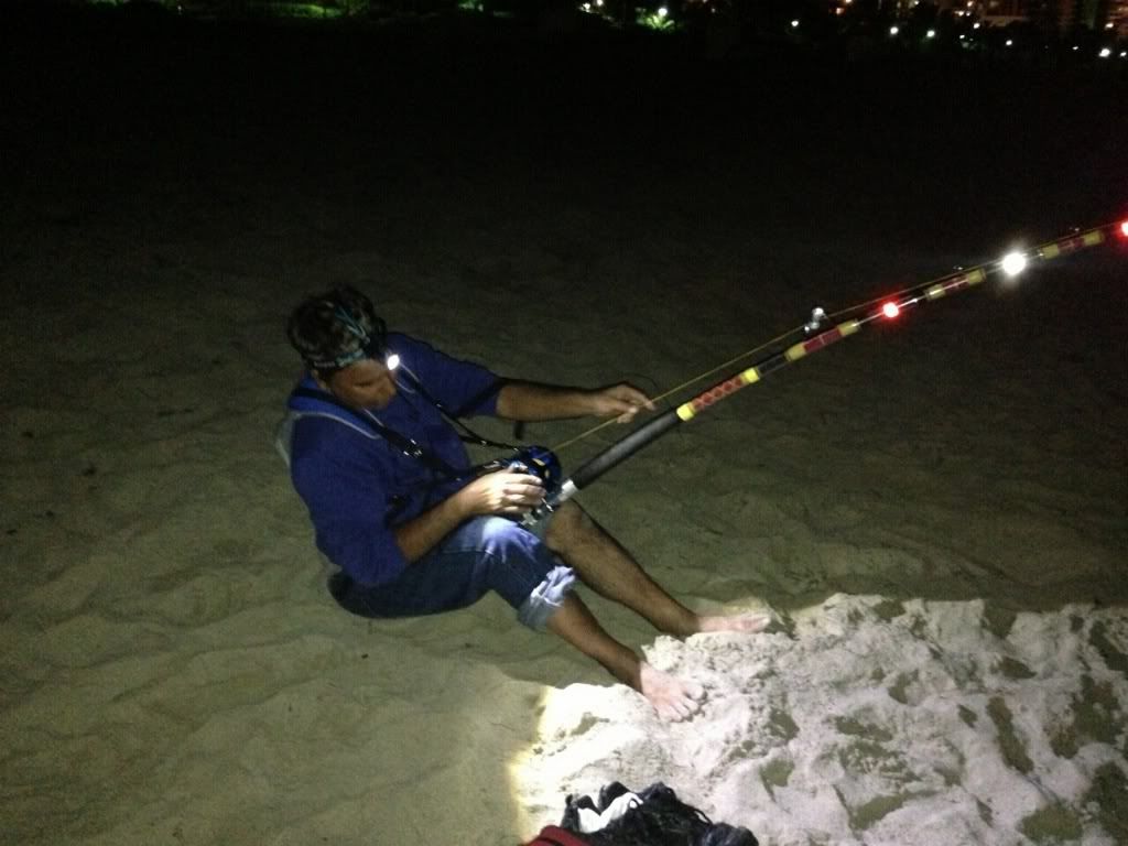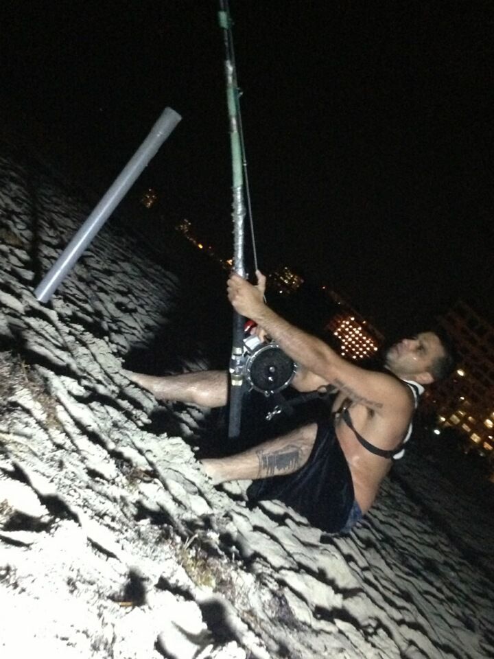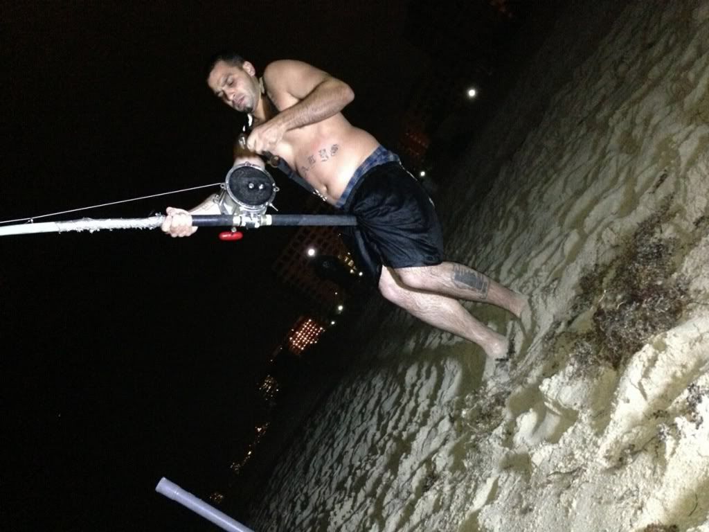 i had no more bait to take out so i did it the old school way and used some of the blacktip i took my bait out about 150 yards when i got back we where all talking till i went and layed down for like 45min till i went and told seawolf lets pick up as i started picking up my 16/0 my 14/0 get's slammed as i set the hook the shar got geen had stared to taking drag the fight was for about 25 min till the line just got slackand it came off the hook..