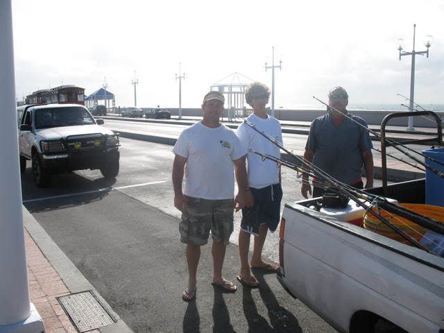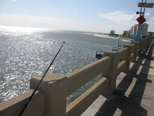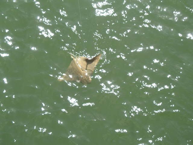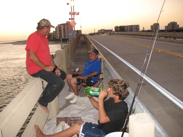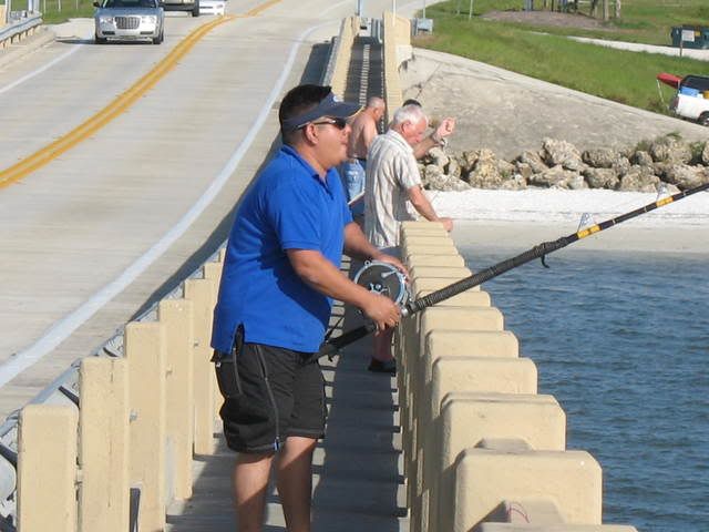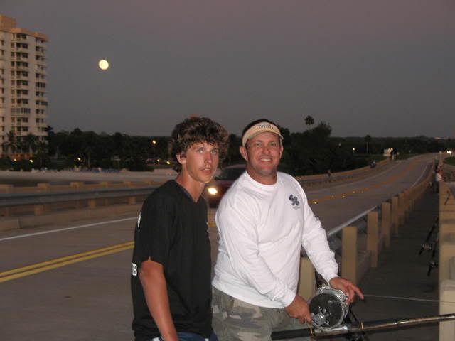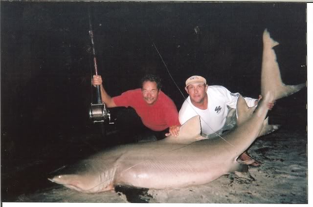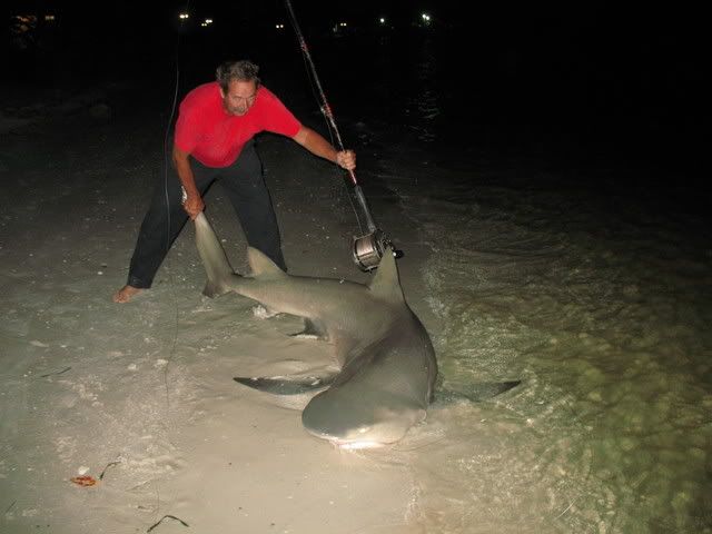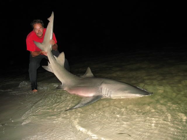 It was fun to get back to the west coast of Florida to wet a line with good friends.We got on the road right after Jimbo got out work on monday afternoon- him in his nissan pick up and me in my toyota pick up.This was the usual routine for Jimbo to pack his truck with gear right after work on monday since he has Tuesday,Wednesday and Thursday off work.Jimbo retains the enthusiasm of a young kid when it comes to his fishing, he can't wait to get out there.So we head out west to Tampa pick up the up and coming rookie Aaron and then we head over to another friends house(Solliman) to have a bar b q and get some rest for the next day's hardcore marathon of bridge fishing. On the way to our spot we stop in St Pete and load up the livewell with pinfish to entice the snook,grouper,snapper,tarpon etc.So we get to our destination around 11 am onload and start walking our gear out to the spot we want to fish.The afternoon sun was beaming down mighty hot on us we start letting our shark rods out in the current (outgoing tide)with fresh fresh cownose rays that Aaron is snagging next to the bridge.Aaron is the new recruit that Jimbo is putting through "shark fishing boot camp" and i can't say enough about this 16 year old dynamo of young man,,,,,he's respectful,he listens and observes and puts into practice all that the older guys are teaching him.This young man never tires,is quick and knows what needs to be done and gets it done.You will see alot more Aaron in the Florida shark fishing scene in the future.Large schools of cownose ray come under the bridge most of the day but just in case i've brought some bonita from my freezer.I start thinking it's a slow day when all of sudden at slack tide Aaron who is fishing almost in the middle of the bridge by the channel gets hooked up. The shark starts to cut fast and Aaron follows him and works him like a veteran,,,the shark is fast but Aaron is right on top of him and when he tries to dive under the bridge the apprentice again has learned well and turns his head just in time.The shark struggles and tries a few more times to go under but every time Aaron prevails.We walk him down to the end of the bridge take a few pics and quickly release the five and a half foot black tip shark.Next one to get hit on a half cownose ray Solliman gets his shark on and it's blasting out of the water in an atempt to throw the hooks,Solliman makes quick work of the black tip ,walks him down to the end for a quick release.Now i'm thinking this is gonna be a great day of shark fishing,,, back to back bt's it can only get better as it gets closer to nightfall.We're staying busy in between our shark hits we are jigging trying for snook or snagging a few rays to have back up bait for our 16/0,and 3 -14/0s.Later that afternoon right before sundown i get a nice slow hit,i set up and it charges the bridge like a jewfish trying to go into his cave .I put the brakes to him and he takes off away from the bridge and we are almost convinced it's gonna be a jewfish .I work him in towards the bridge and by now it is dark and the fish is thrashiing on top but we can't see what it is yet.Then i see in the splash right next to my fish a big boil and i start yelling that it looks like a huge hammerhead.Things are starting to happen real quick now -it's slack tide again and right then Jimbo's 14/0 that's right in front of where i think i saw the hammmer get's picked up ,he slams the reel in gear and the supposed hammer starts going under the bridge and Jimbo can't stop him so he puts the reel in free spool and instructs Aaron to go to the other side of the bridge gaff his line and bring it up so we can try to catch the shark on that side.Meanwhile i'm still fighting my fish while this is going on ,,,i tell Solliman to come sit on my 14/0 rod so i can help Jd with the hammer that has him down to half a spool on the opposite side of the bridge.Solliman looks down after taking my rod and tells me my shark is a lemon not a jewfish,,OK.We have Jimbo's line in hand and it's still hauling ass away from the bridge Jimbo who now has his line in his hands is trying to stop him bare handed without gloves so we can cut the line, tie a quick blood knot and fight him with the 14/0 on that side .At this point expierience makes the whole world of difference as to whether we catch this shark or not.So Jd stops the shark with his bare hands at this point i get next to him making sure the shark is tired and that we have enough line on the floor to do the tie in(blood knot).At the moment you cut the line the shark can not be taking offf or you will be screwed.Jimbo gives the go ahead to cut the line ,the 14/0 is quickly brought over from the other side of the bridge, i quickly tie the end of line coming out of his 14/0 to the end of the line that Jimbo is fighting the shark on.DONE!!!Jimbo grabs the rod in his hands and just in time because the shark has got it's second wind and is taking off again.The battle goes on and Jimbo is gaining all the lost line that is coming into the reel frayed up from rubbing beneath the bridge.So he fights him on medium drag now because the veteran knows that frayed line means reduce your pressure or risk popping off your shark.We get him up next to the bridge and by now i knew it was not a big hammer by the lack of full blown speed the hammers typically display.Big Lemon and Jd and i get him to the end of the bridge,we measure him 8 ft 11.5 inches and we send Aaron to Jd's truck for his camera since mine had dead batteries by then.Aaron on the way to the truck finds Solliman who is still on my lemon shark trying to walk the shark to the end of the bridge by himself but the current changed and is dragging the shark under the bridge so Aaron helps him and they release the 7 foot lemon.Aaron was taking a long time getting back with the camera so we were lucky to squeeze two more pics out of my camera and quickly released the pissed off lemon.After all that commotion we took a break, dr