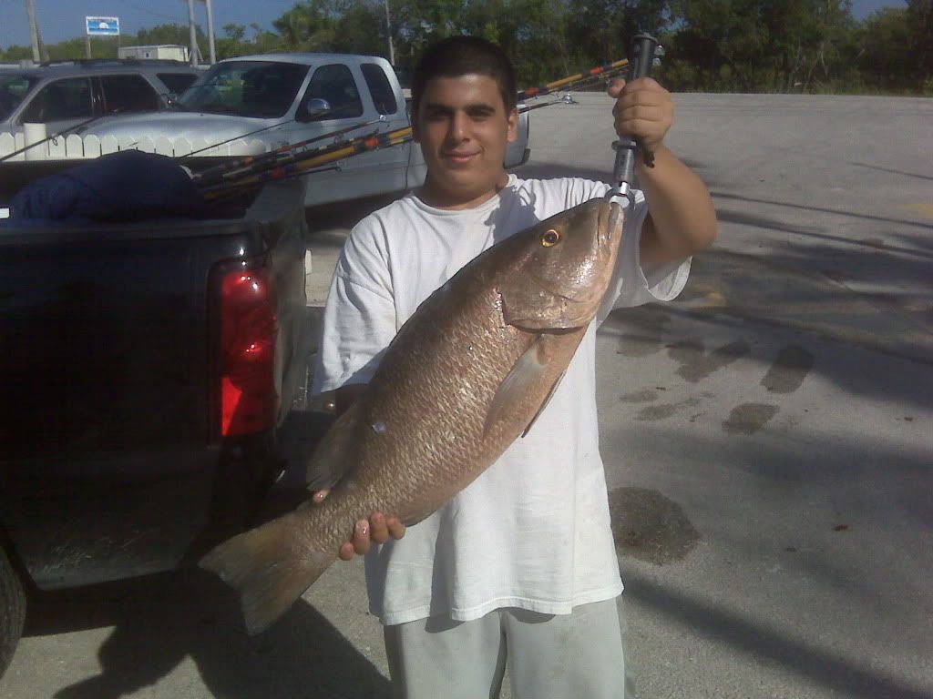 me hammer jimmy and johnny decide to go to the keys we stop at a tackle shop for sabikis and the lady there is preaching to us that boat fishing is better than a bridge blah blah blah land is boring blah blah finally we leave and go to long key and walk tubelures and jimmy who is a little ahead of me walks into a school of crevalles and he gets 2 crevalles and johnny goes into the water with his diving gear and swims into the school of them and spears them we try chasing them around more but no luck so we have our shark bait now we want snapper bait because there are some decent mangroves there so we get dork/dwarf jacks and greenies and put them on ice and make our way to white street pier after we load up we get the big crevalles and cut them in half and casted them out on our shark reels then we go to snapper fish but theyre not there all we get is bonnetheads. later on we run out of water so me and johnny volunteer to go get a gallon from the nearest gas station and while we were gone a school of blacktips came and cleaned all of the baits except my rod and hammer landed 2 5 ft blacktips there were problems with my camera so we couldent take a picture so we just let it swim free because by the time i would get my camera working it would be dead. so later on im sitting down talking to johnny thinking it slowed down and i see hammer using live grunts to try and land snook and i think hmm i want a keeper snook and hammer must know what hes doing let me copy him and hit a sneak attack so i get the sabiki rigged with bait get a grunt and walk him around the pier i walk him around the first corner to the side the rocks are at and walk the grunt to the end of that side and i reel him up and cast him just past the rocks in no more than 3 1/2 ft of water and he gets hit i feel whatever it is take the bait and the rod bends 3 times and i set up whatever it was starts stripping me at leadt 40-50 yards and im thinking i either got a huge snook or a huge tarpon and i slowly bring it in he takes 1 or 2 more short runs and i not saying a word nobody knowing i have a fish on and i get him to the top and i cant make out what it is due to it being dark so i walk it around the second corner where there is a shorter wall and where there is more visibility by this time i shout i got one come help me flip him so johnny comes thinking i have a tarpon and hes coming for no reason and he looks over the rail and flips and goes holy s#!T and starts running to get his lobster net and i shout what is it and i hear crevelle and i think what the... thats no crevalle if anything a grouper while johnny is running away hammer and jimmy are walking towards me and as soon as hammer sees the fish he goes jimmy get that fish grab him by the gills so jimmy flips it over the rail and i thought GROUPER!!! then hammer goes a cubera!! it was huge 32 inches and fat and i flip out with the biggest snapper of my life i couldnt belive it. later on that night we were throwing plugs and jimmy gets a 30 inch snook keeper and then it starts to rain and shortly after we left we went to bud' n' marys to weigh it it was 16 lbs and we notice that it doesnt exactly look like a cubera it looks like a mangrove but none of us can tell so we assume its a cubera/mangrove because its neither it didnt have the stripes of a cubera but it had the teeth of a cubera and the color of a mangrove and johnny says there is a species of snapper that is half and half so i guess its that so if you can tell me which one it is that would help alot and if it is a mangrove i screwed up big time because it couldve been a record and its already filleted so too late. here are the pictures see if you can tell me what it is. on the way home we stop at that tackle shop to prove the lady wrong but she wasnt there
