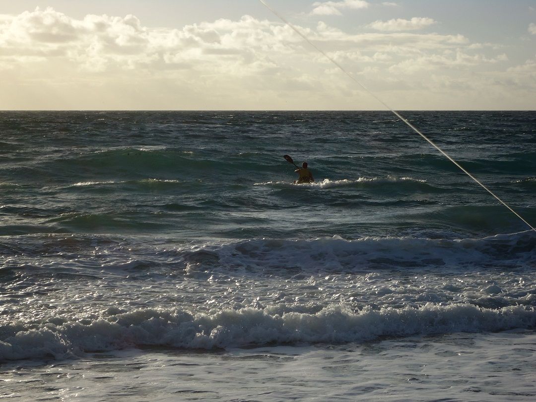 Josh's Canadian friend Kyle joins us on the beach and he is a natural on the kayak and on the sand .Kyle takes the yak out to a reef about 600 yards out and catches some reef fish for possible shark bait.