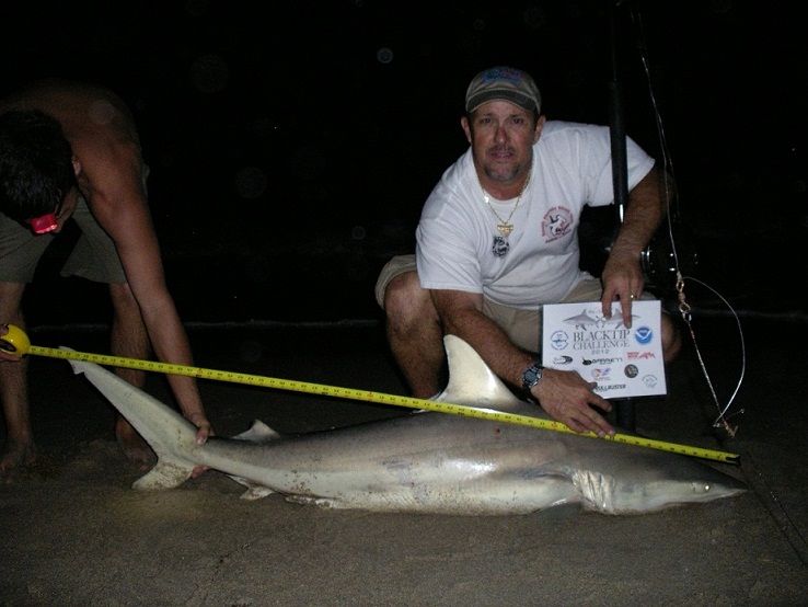 On Thursday the weather report says that the winds were going to shift to the South/West Friday then West Saturday producing calmer waters for everyone.Those that know how to make the adjustment in any condition such as Old man Hammer know all the tricks for every occasion and finds calm water in Miami in a spot very few know and fewer even fish ,,,,,,he catches an 8 ft 6 inch Bull Shark but decides not to enter it because he forgot the bag with the BTC tournament banner inside .That makes everyone else try harder once the wind subsides.For two days straight teams and individuals are wiped out by very rough conditions very tired and hoping to get into some real sharks.Some fish by casting into the rough surf without kayaking and some just plain quit while they wait for calm seas.This year ,,,,the BLACKTIP MIGRATION IS LATE --OUCH!!