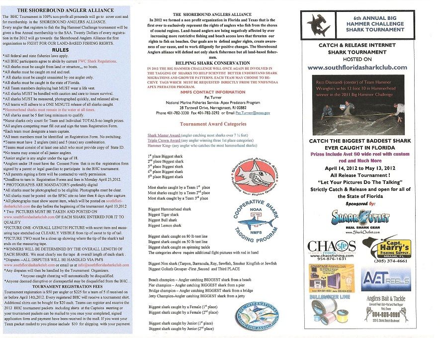 THIS YEAR A VERY SIGNIFICANT EVENT IS OUR RECENT LAUNCHING OF THE SHOREBOUND ANGLERS ALLIANCE IN FLORIDA AND TEXAS TO COINCIDE WITH THE 2012 BIG HAMMER CHALLENGE.WITHIN THE NEXT FEW DAYS THE SAA WEBSITE WILL GO LIVE.THE SHOREBOUND ANGLERS ALLIANCE IS THE FIRST EVER ORGANIZATION CREATED TO REPRESENT THE RIGHTS OF ANGLERS WHO FISH FROM SHORE.FROM THIS YEAR'S BHC TOURNAMENT TWENTY DOLLARS OF EVERY REGISTRATION FEE COLLECTED WILL BE DONATED TO THE SHOREBOUND ANGLERS ALLIANCE TO HELP WITH THE PROJECTS WE ARE INVOLVED IN.ONE OF OUR KEY PROJECTS WILL INCLUDE PUTTING A LAW FIRM ON RETAINER TO LEGALLY CHALLENGE CITY ORDINANCES BANNING SHARK FISHING FROM BEACHES. YOUR PARTICIPATION IN THE BIG HAMMER CHALLNGE IN 2012 GET'S YOU A ONE YEAR MEMBERSHIP IN THE SAA.OUR GOAL IS TO MAKE THIS ORGANIZATION THE VOICE OF THE LAND-BASED FISHERMEN IN THE COASTAL STATES OF THE NATION.OUR OBJECTIVES INCLUDE PROVIDING YOU THE INFORMATION ON ISSUES AFFECTING THE LAND-BASED FISHERMEN AND PROVIDING GUIDANCE AND ADVICE ON WAYS WE CAN BECOME INVOLVED TO DEFEND OUR FISHING RIGHTS AND MAINTAINING BEACH ACCESS RIGHTS.THE ROAD AHEAD IS LONG AND HARD BUT THANKS TO YOUR PARTICPATION IN THE BHC AND THE HARD WORK OF VERY DEDICATED INDIVIDUALS, THIS ALLIANCE OF SHOREBOUND ANGLERS WILL MAKE IT'S VOICE HEARD AND WORK FOR FISHERY REGULATIONS BASED ON SOUND SCIENCE AND NOT ON HYPE.OUR VIEWS WILL BE RESPECTED BECAUSE WE ARE PART OF THE RECREATIONAL FISHERMEN IN FAVOR OF CONSERVING THE RESOURCES FOR THE BENEFIT OF ALL.THANK YOU FOR YOUR SUPPORT OF THE BIG HAMMER CHALLENGE SHARK TOURNAMENT,THE SPORT OF LAND-BASED SHARK FISHING AND MORE IMPORTANTLY OF THE ORGANIZATION THAT WILL DEFEND YOUR RIGHTS ON SHORE.