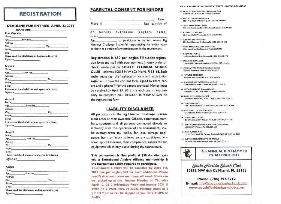 Here is the Registration form that each angler fishing the 2012 Big Hammer Challenge is required to fill out and sign .Please read all the RULES as they have changed since last year.Of significance is the fact that Hammerhead sharks must be left in the water to measure and photograph also the ONE MINUTE DRILL is required for all sharks to swim off safely. You can copy the registration form and have your team mates fill out and sign and mail back to us with your team total payment.Once we have recieved your completed form with payment we will send out the team packets starting April 1st once we have the 2012 BHC edition long sleeved t-shirts from the printers.Along with the BHC packet you will recieve the sponsor banner that you must use in your pictures.