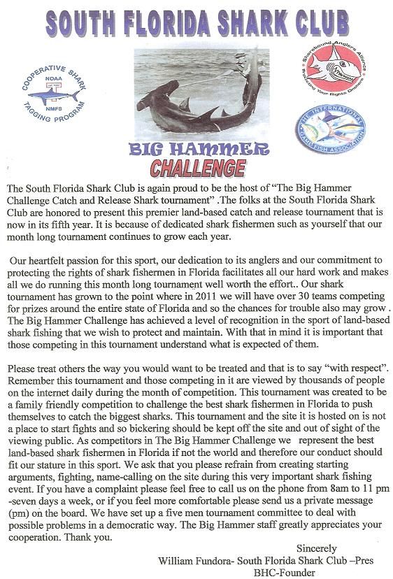 SOUTH FLORIDA SHARK CLUB -President SFSC-Founding Member est 1983 SFSC-Website Administrator BIG HAMMER SHARK TOURNAMENT -Founder Rene Memorial Sharkathon -Founder NMFS Shark Tagger