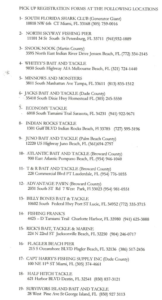 SOUTH FLORIDA SHARK CLUB -President SFSC-Founding Member est 1983 SFSC-Website Administrator BIG HAMMER SHARK TOURNAMENT -Founder Rene Memorial Sharkathon -Founder NMFS Shark Tagger