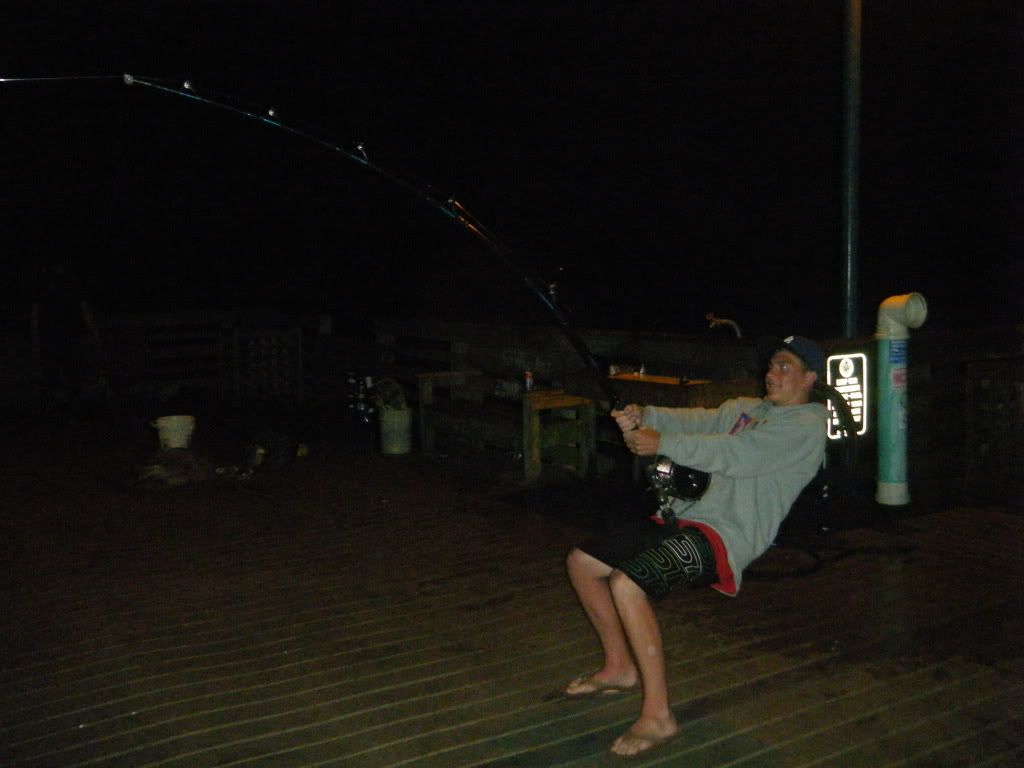 then i start with tonys rods i take his 2 14/0 then his 12/0 filled with 80lbs test and his other 12/0. when ima take my poles out joes 9/0 gets hit a real slow run then it stops then it starts again and stops, it was doing this for 3 min. so joe got pissed and did the running man. when he starts reeling in he notice it feels like he is bringin in a big brick pavor, after about 20mins it comes in an 8 ft 8 inch nurse curse.