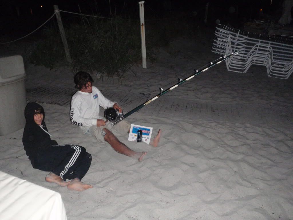 We took a 2 hour trip up north to a spot tony wanted to hit. we get there around 7 pm and joe "sand tiger" is the first to take out his bait. I guess he didnt see the 4 foot waves that fliped him and washed him to shore so i told everybody i"ll take all the rods out. i start with joe's rods first his 14/0 then his 12/0 and last his 9/0 with 50 lbs test.