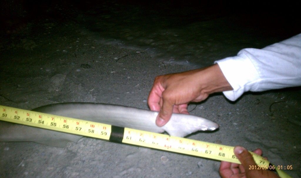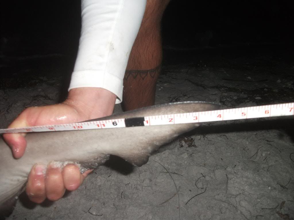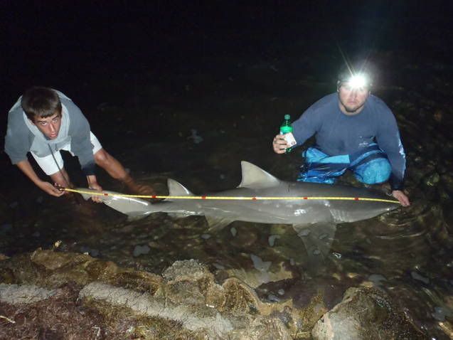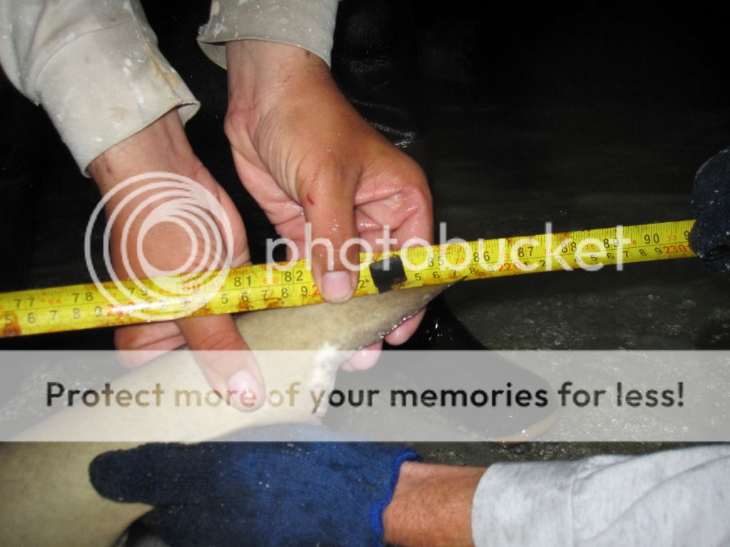 . I thought the fish was gone for sure. Frantically reeling in i feel the fish fighting back. Relieved that I didn't lose it the fight continues on for what seemed like forever and as the leader came out of the water and as Nino and Andrew grab it they fought to hold on to it. The fish pulled away from us and fought for another while. I could see now losing the fish and just having been so close to it to be able to touch it. Fatigue was setting in and it was either me catch this fish now or fight it all night. As i lock down the drag for my final hope to land this fish we see the fin yet again. ![]()