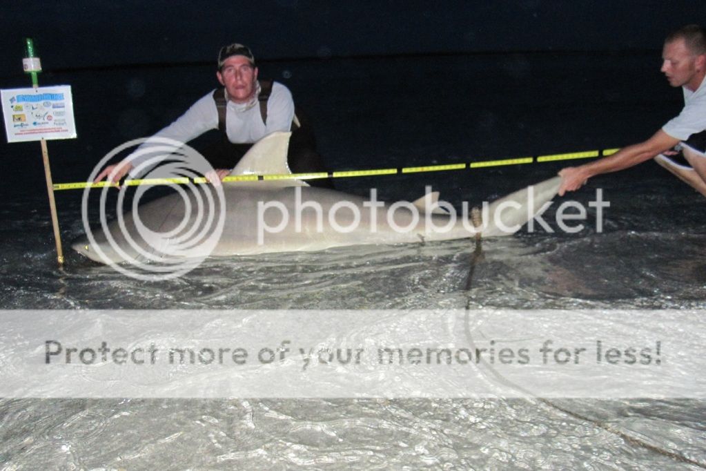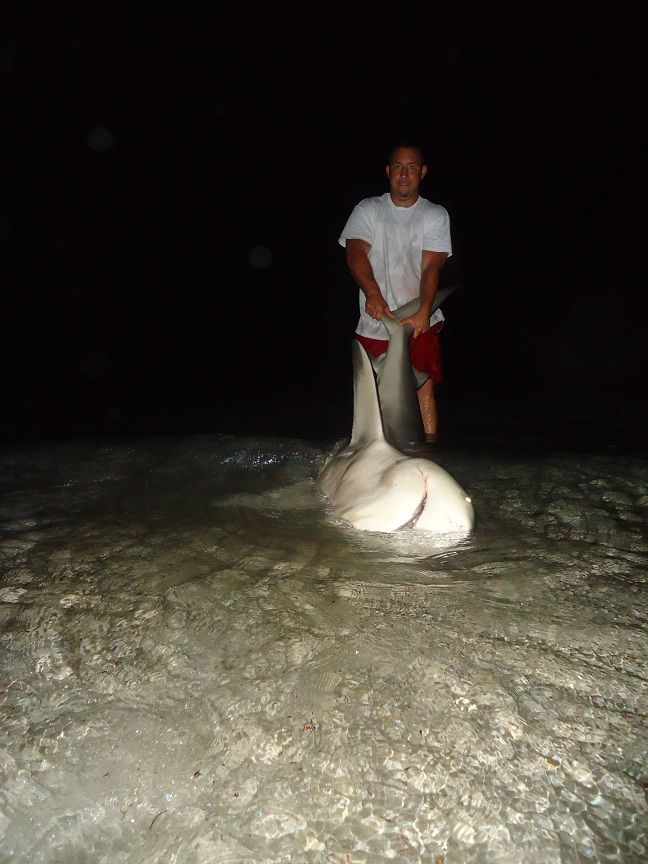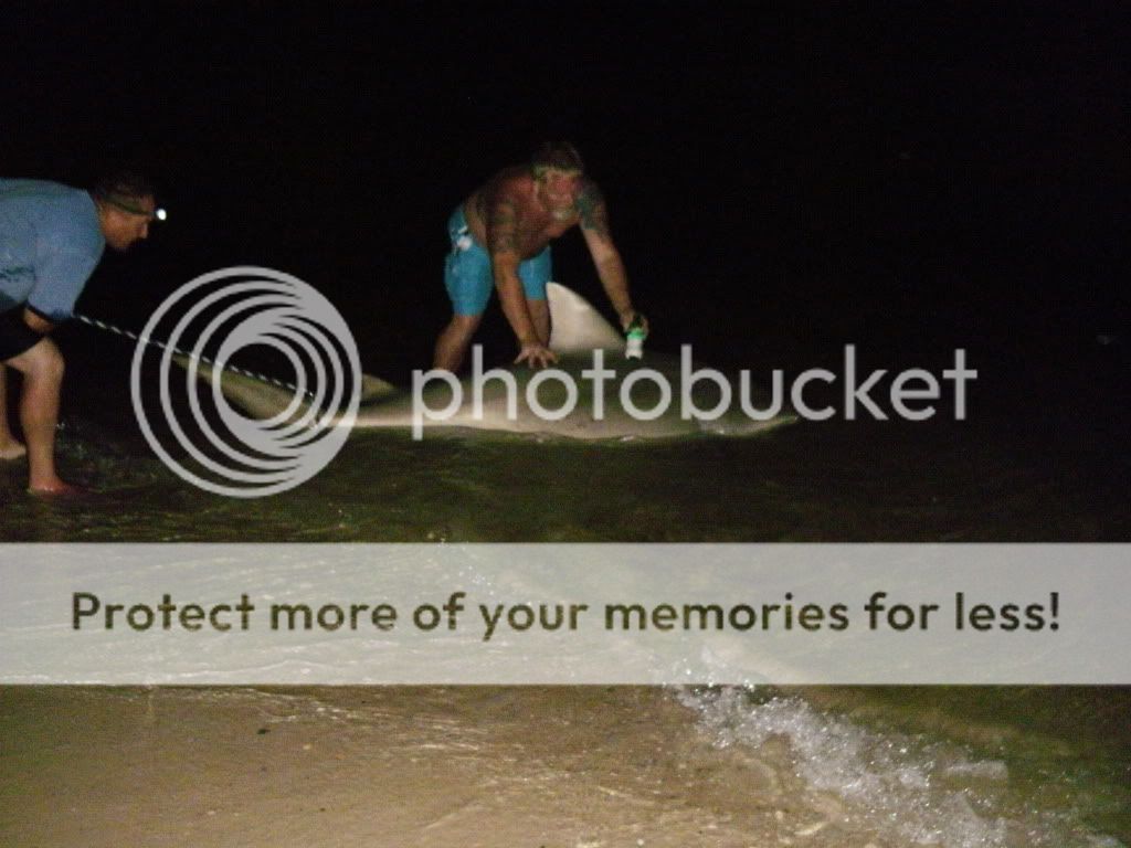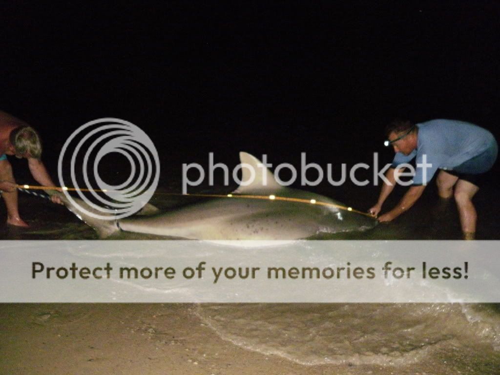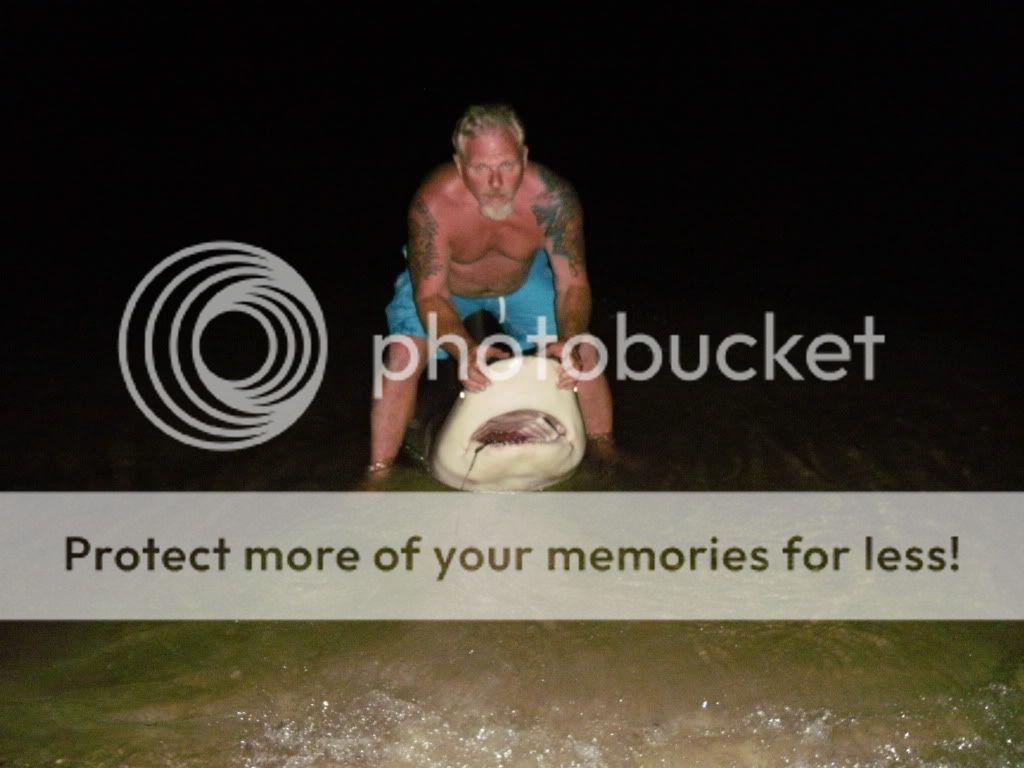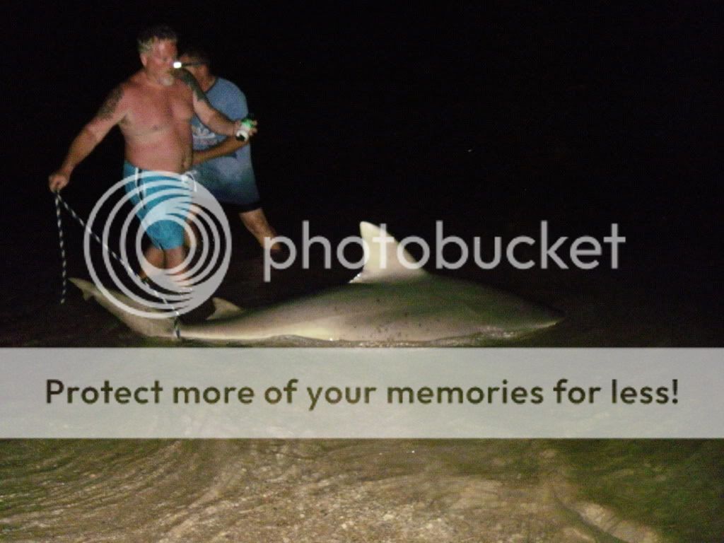 A few days after having caught the 8 ft bull posted above this one, lucky Shannon gets another bull also 8 ft .This was the only hit of the night at 4:30 in the morning and caught on a half of a 40 lb Amberjack for bait.Chris Salomoni (snookhunter) fished with Shannon and I but he left at 1 am ,,,,,,,6 baits in only one bite and one shark.Sometimes it pays to stay late.