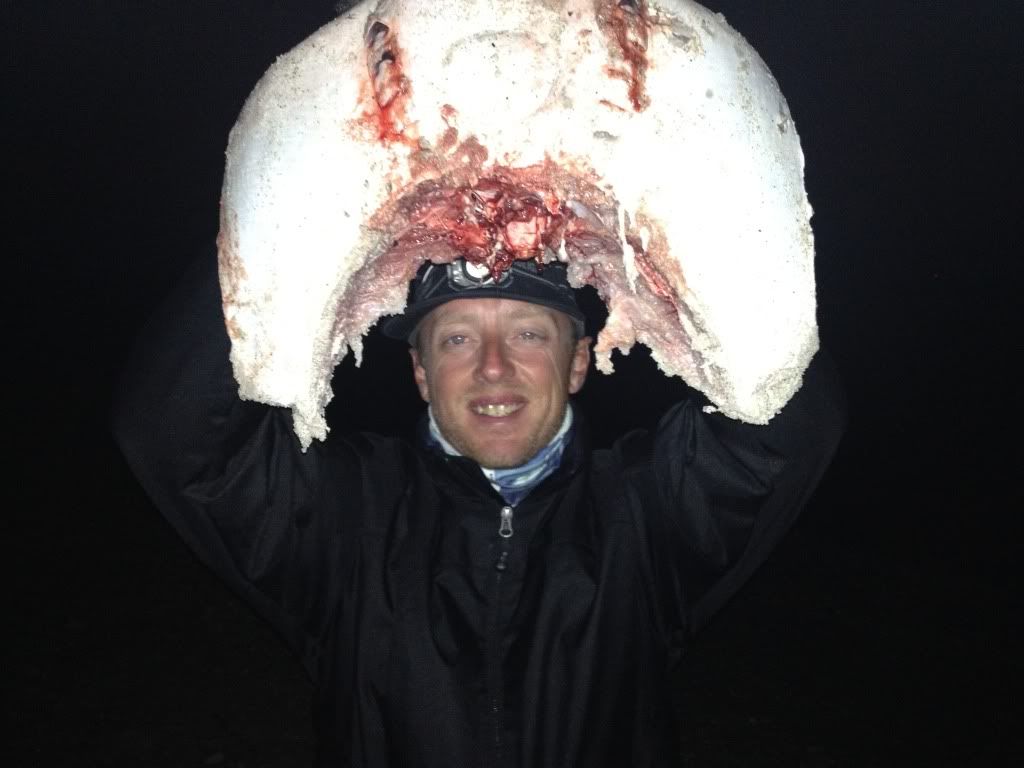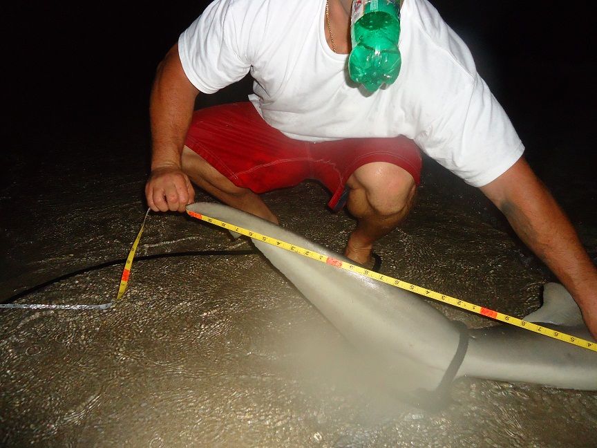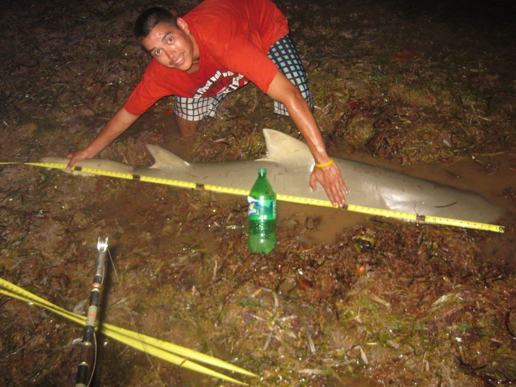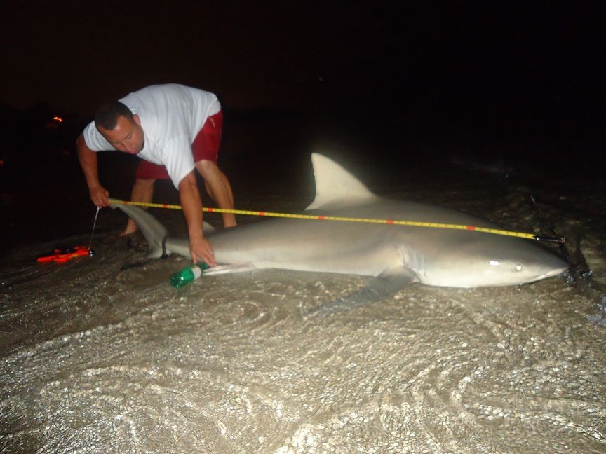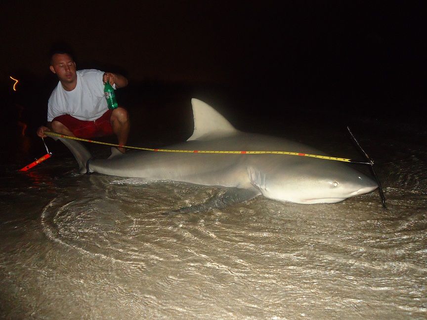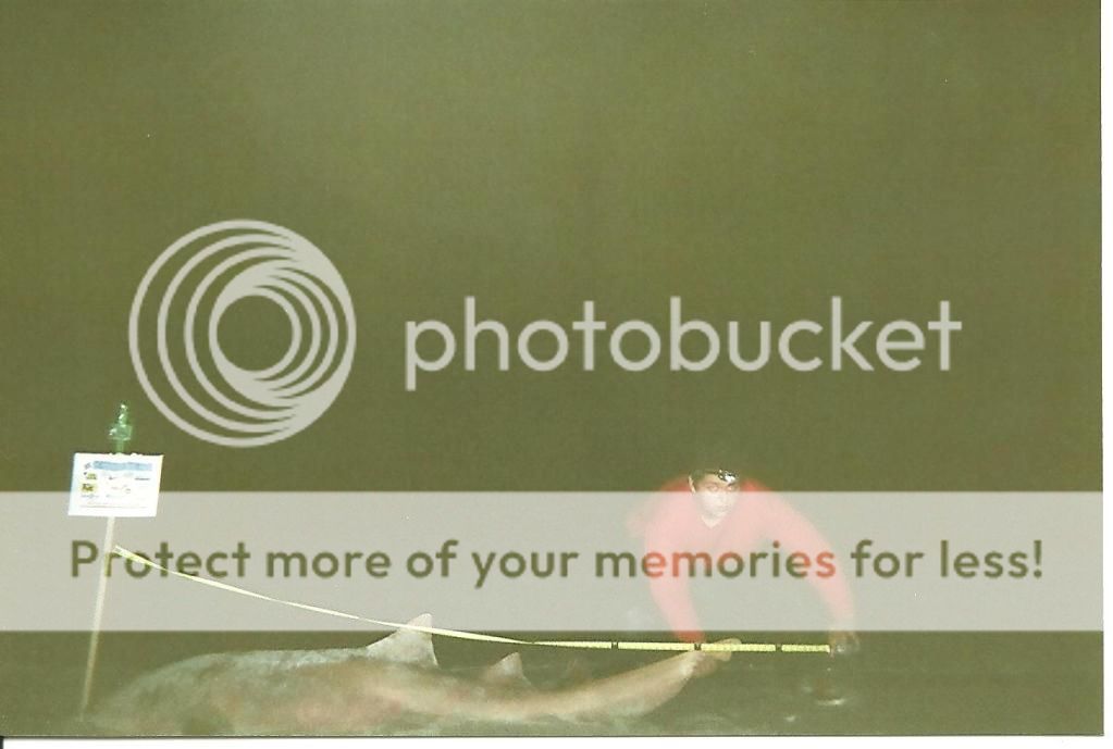A few days after having caught the 8 ft bull posted above this one, lucky Shannon gets another bull also 8 ft .This was the only hit of the night at 4:30 in the morning and caught on a half of a 40 lb Amberjack for bait.Chris Salomoni (snookhunter) fished with Shannon and I but he left at 1 am ,,,,,,,6 baits in only one bite and one shark.Sometimes it pays to stay late.