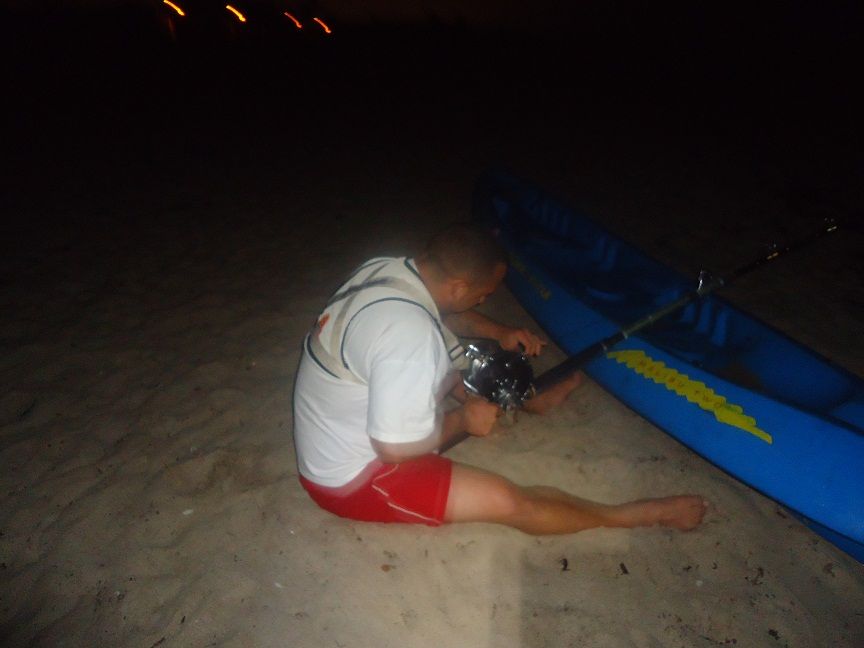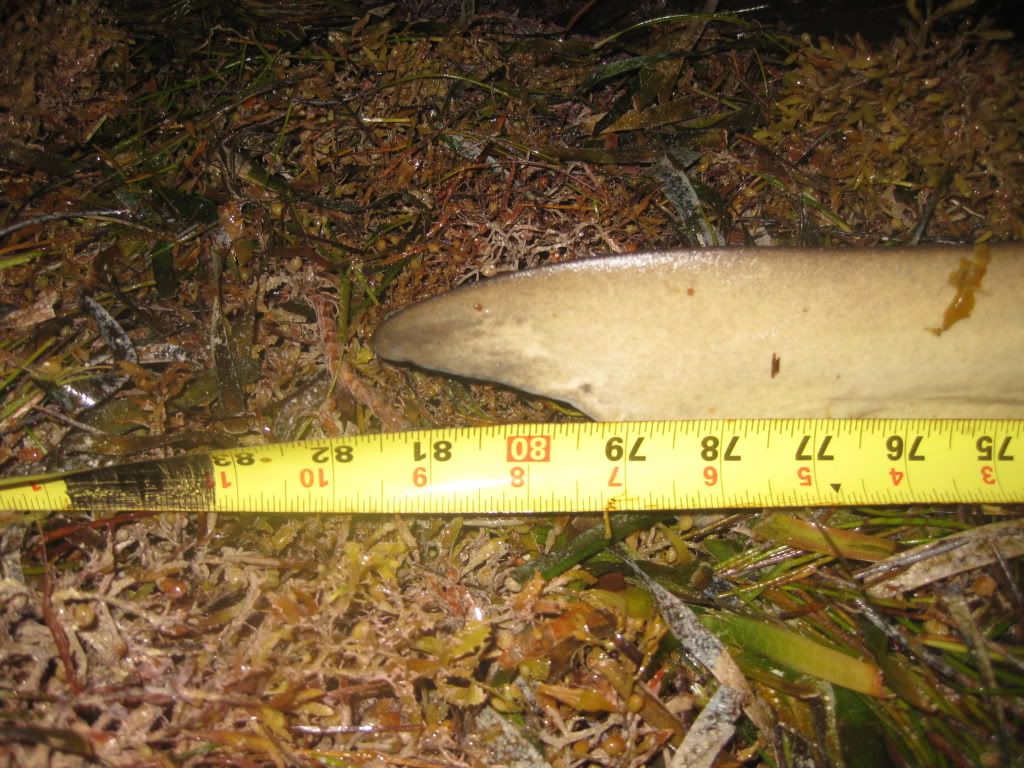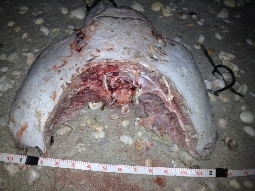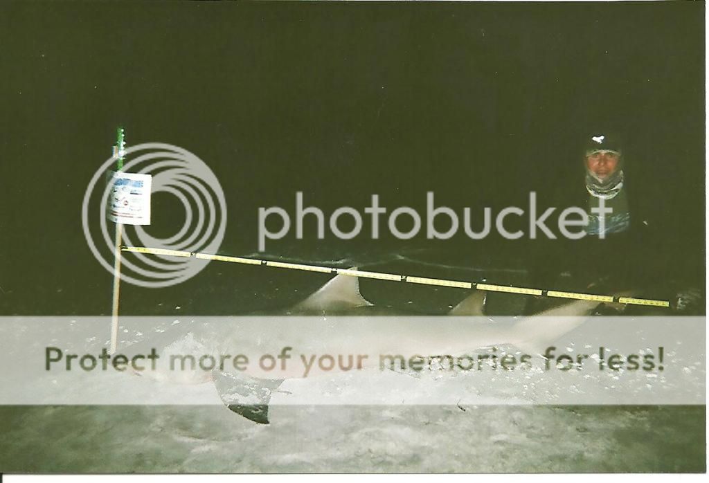 During the off season we have scouted alot of beaches. We found several good beaches we said we would fish during the BHC. When it came time to make a choice, we just could'nt pull away from the beach we fish all year round. We are dedicated to the pass. We take great pride in knowing how to fish these tough waters. We see alot of sharkers visit the pass and within an hour, they leave. After saying all that, we catch some impressive fish all the time. Not too often do we miss a hook up. Ever since the BHC has started we have been presented with a new breed of shark. Beleive it or not, they're getting smarter. Just like we fish the pass and learn new tricks, so do the sharks. This year we have not caught any big sharks. We spend 4 days a week down there and normally just get 1 good run. Its very hard to keep positive. The ray in this picture was from this past weekend. This was the one we've been waiting for. This was a heart breaker!!! To fish so hard and long, only to reel this in. When this shark hit, all it did was make the glow stick bounce just a little, like mullett swimming though the line. He hit it just right. Effortlessly cutting through the ray like a hot knife through butter.