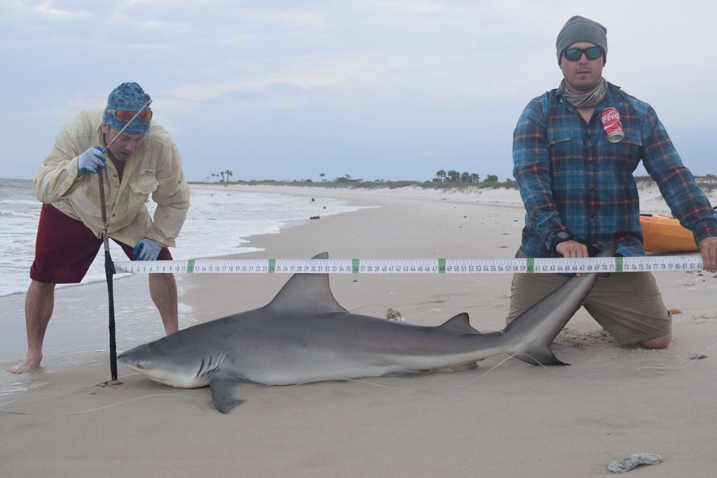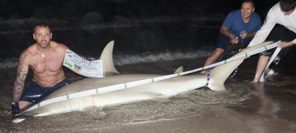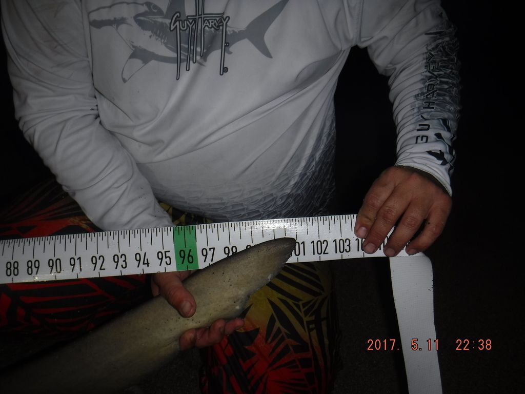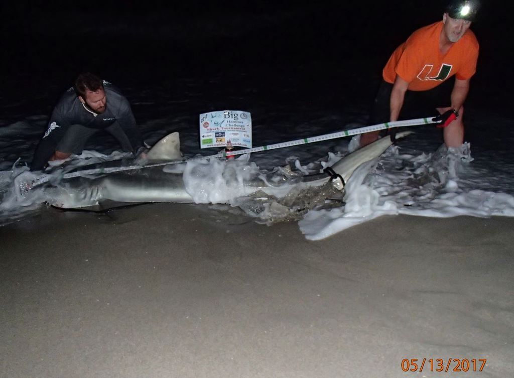 So Jay and I head out to the South Skyway Fishing Pier, and none of our other team mates decide show up or want to go out. We looked at each other when we got there, and told each other, “we are going to hook something big to tonight.” So about 2 hours after we get there, the tide starts going slack, and then about 15 minutes after that, Jay's 14/0 starts screaming. So he lets the fish eat then about 5 or 6 minutes he sets hook. He asked me to run get his harness, so I do, and by the time I get the harness and catch up to him, the fish has taken him all way down to the first bathroom on the pier, which is about 6 light poles from where we were fishing. About a 45 min or longer tug of war is going on with Jay and the fish at this time, and we have no clue what it is and Jay finally gets it close enough to see what it is; its a huge lemon shark (looks about 11 foot)! Jay finally gets the shark close enough to the pier, so we can start walking her down, and Jay gets about 2 light poles away from me, and the 9/0 starts, to click which was set up for jew fish. I grab the 9/0 and start, the tug of war. What ever the hell hit, it was huge. I have no clue what it was, as it wrapped me around the piling, and the line popped. I reel up and put the reel in the truck, and grab the banner and the tape and head down the pier to catch up with Jay. As I am getting close to him, the shark seemed pulled the hooks!
