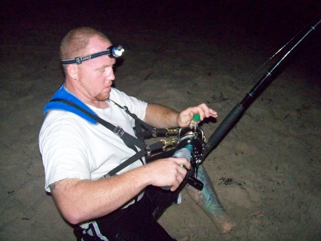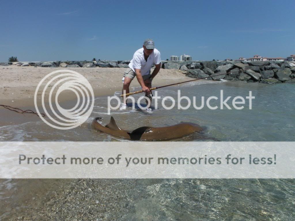 I tighten up and put the hook to him. And the rod bends in half. Screaming drag. Luckily I have ayden to get my harness and a couple fight shots. At first run I knew this was no tipper or bull. Wasn't long before I was dumping bottles of dasani on the reel as it was getting pretty hot. Nicky showes back up.. I look. Over and say BIG FISH . So I fought it for a little while longer until I saw it. I saw that big dorsal and grew very happy. Wasn't long after seeing the dorsal rope was on tail and we wee going through the mission of photos with a big fish thrashing around in bog surf. I measured him at several inches.over 10'2 but those were the best photos we could get in a quick manner and photos were takin. Planted the tag wrapped rope around his hammer walking him down the beach in chest deep water.. He grew tired of this.and started pulling against it and I reached down for the clip pulled and off he went back into the depths with one last splash of the tail as he took off!! A very worthy opponent .