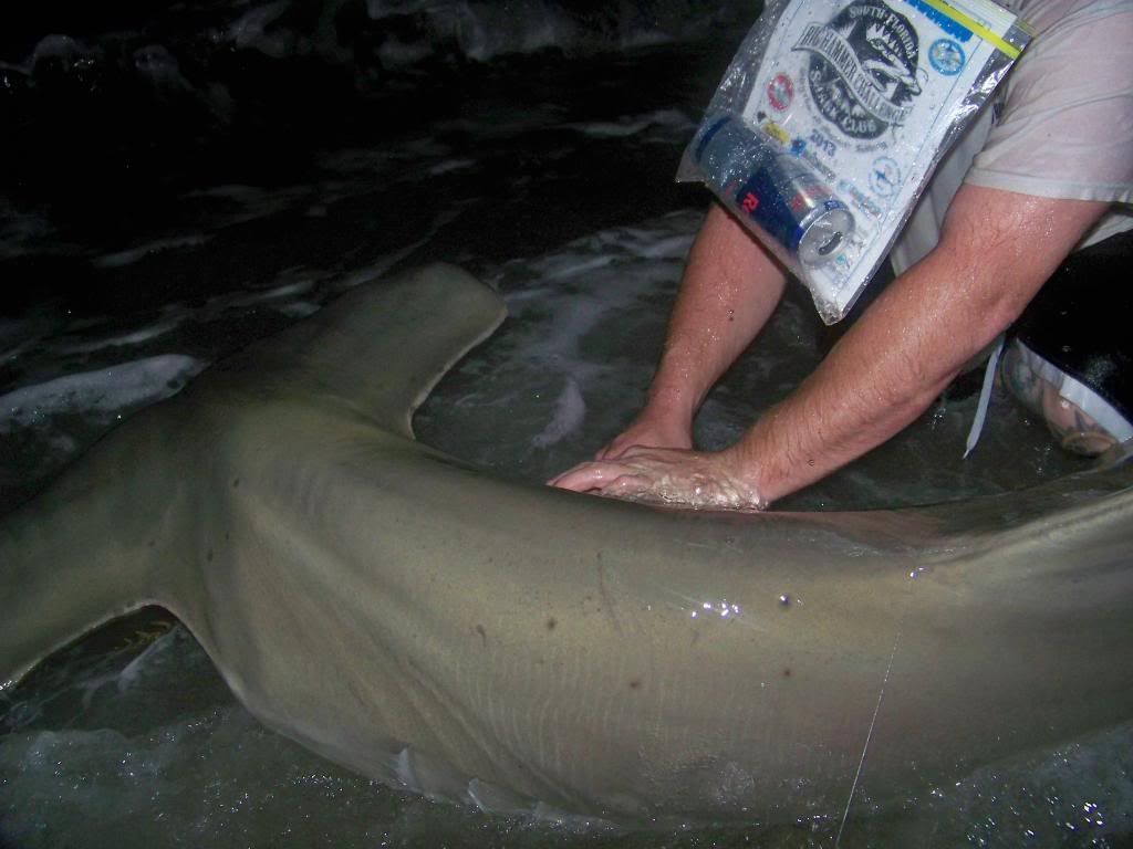 big momma on the beach Team Black Bart's Troy Weber with a 13 foot Hammerhead caught from West Palm Beach
