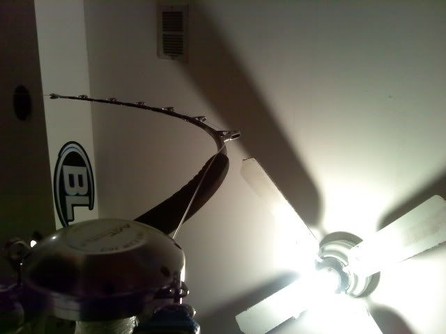 That is a 6'3" 40-100lb parabolic Blackfin e-glass rod of mine with about 40lbs of drag. good Dolphin, White Marlin, sail fish rod but big fish its worthless.
