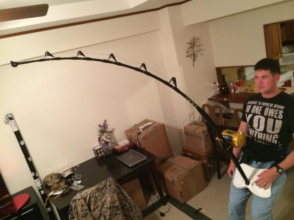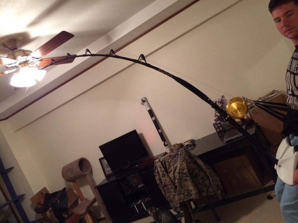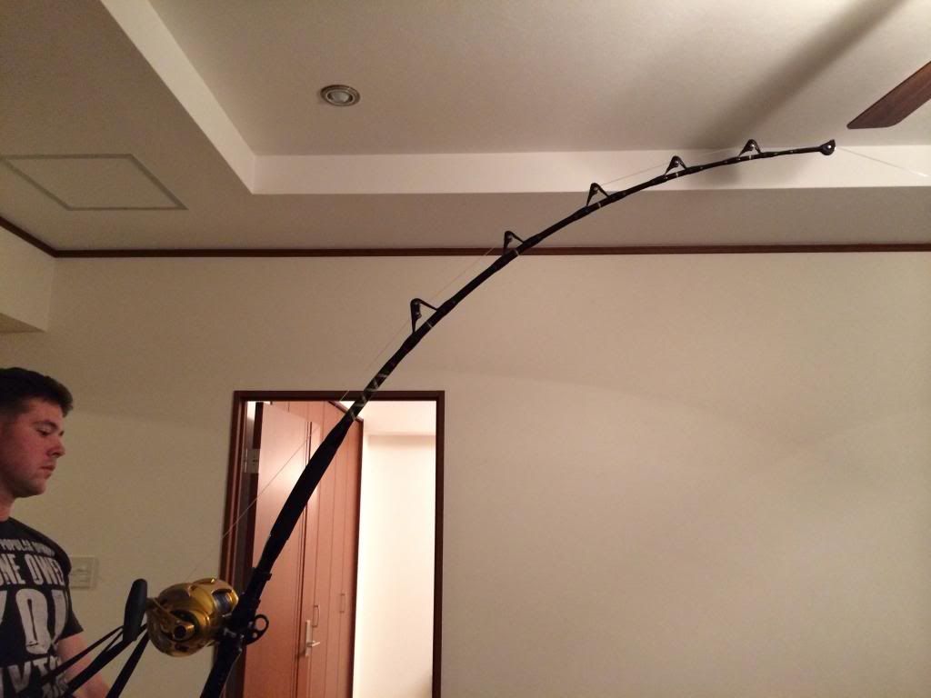 so here it is. 41lbs and the drag barely slipping. the tip points down range (where the fish should be) and I barely have to lean back. much more comfortable than using my 5'6" stand up rod rated at 130lb. you can see the line in the pics, Jeff and I both agree the stripper guide could be a little closer to the reel but after applying more pressure the line didn't touch the blank and the tip flexed. I will try to get pics of it bent with 70lbs of drag.