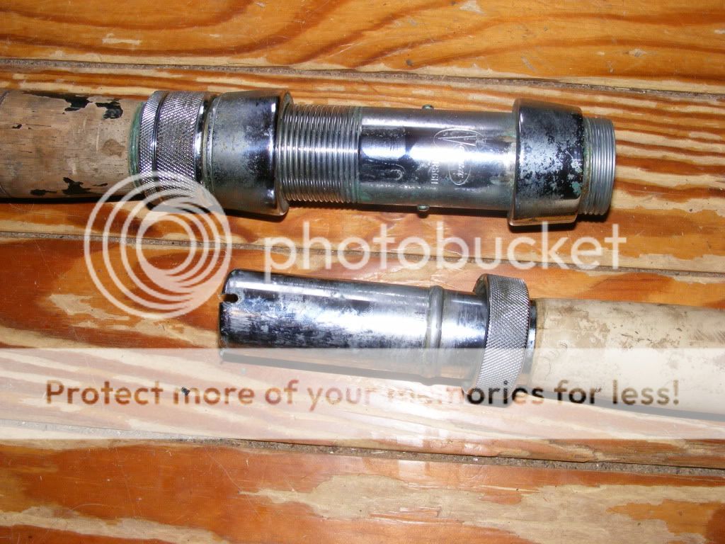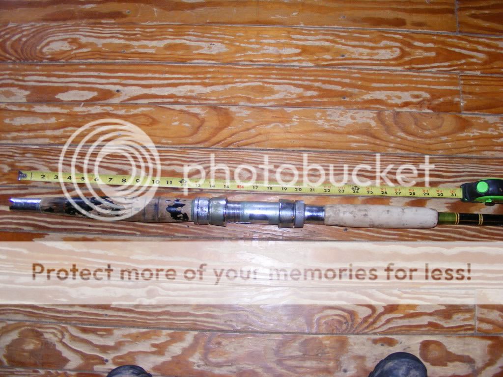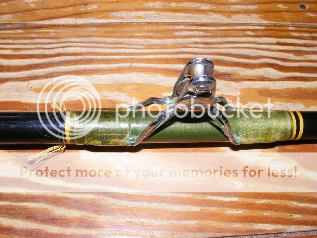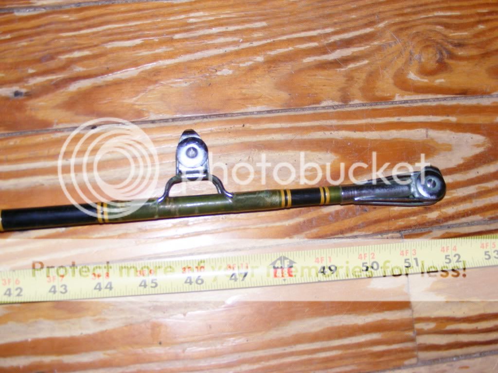 just got an old Harnell, or what looks to be a harnell, it has the harnell rubber foregrip anyways, mildrum rollers and tip, wood rear section that was painted black and a Varmac #6 seat. Best I can tell from measuring the section behind the tip is that it is a 130lb blank, 580 I suspect from the chart. The rear end of the blank has very thick walls also. It does have a little bend to it, not the broomstick I suspected it could be.