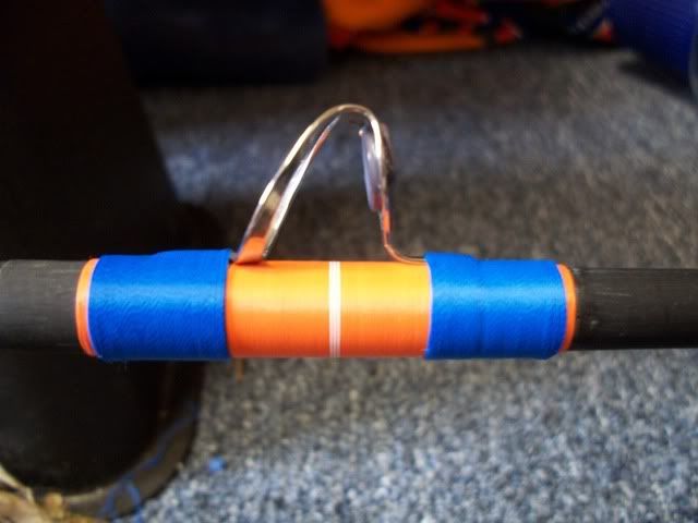 It is a Seeker 775-8 blank, which I cut down to 7'6" to stiffen it up a bit, still has pretty good bend though. American tackle seat. Aftco Tuna Block. 12" Rear Grip, 14" Fore Grip. Fuji Heavy Duty Boat Guides 25-20-16-12-12-12-10-10. Still needs a tip