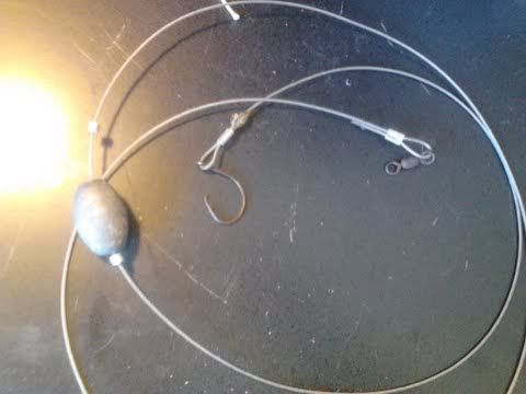 6' of 1/32 cable crimped to a 350 lb swivle. on the other end I have a stopper then a 4 oz weight and a stopper above it to hold in place. then about 1 1/2 feet down from the weight I have a 7/0 circle hook. It's cheap and can take a lot of abuse. With a 7' rod I can cast almost 50 yards with a chunk of bait. Good luck