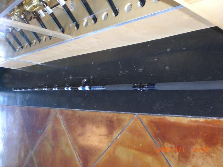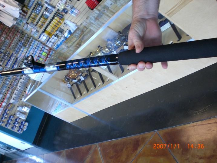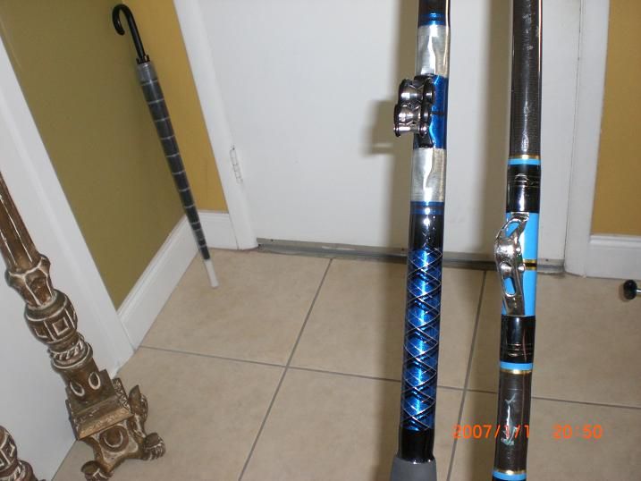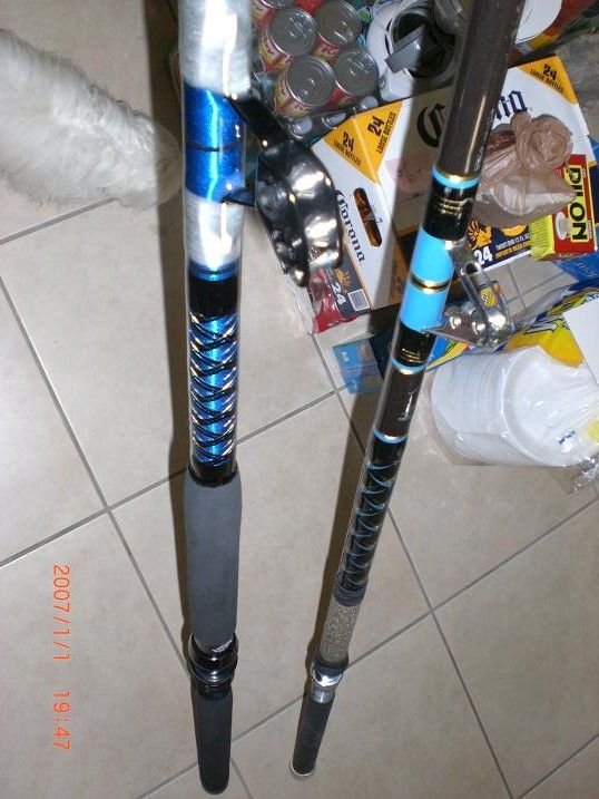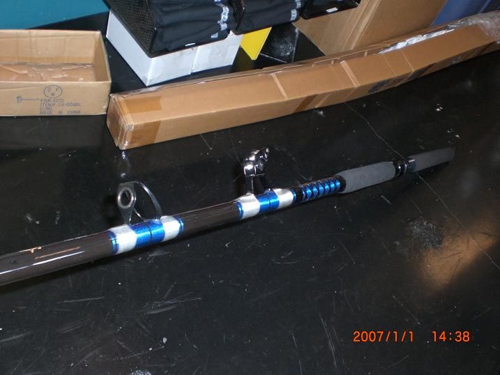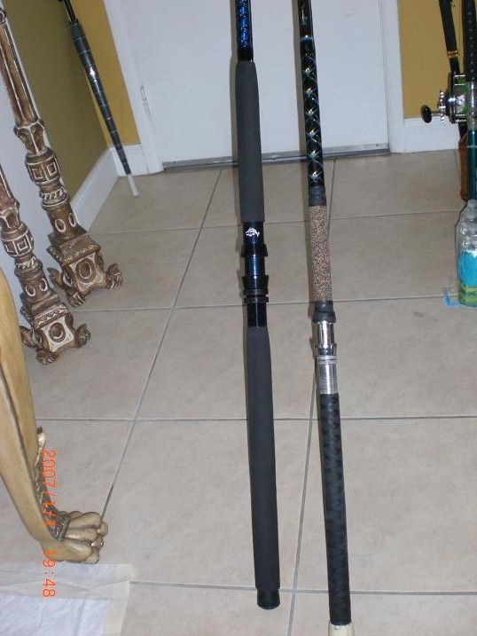 My old Gatorglass 130 lb rod on the right and the BEAST on the left side.Notice it's thicker.New rod has a longer butt ,bigger reelseat,longer foregrip and Ceramic guides vs the old school foul proof guides