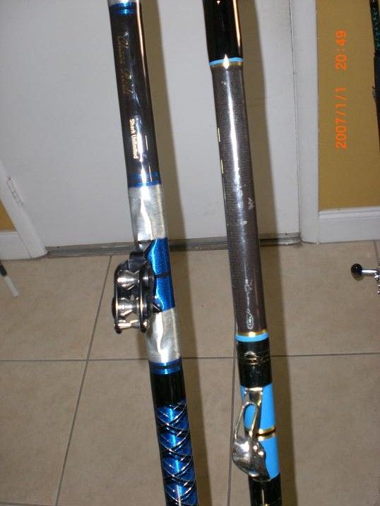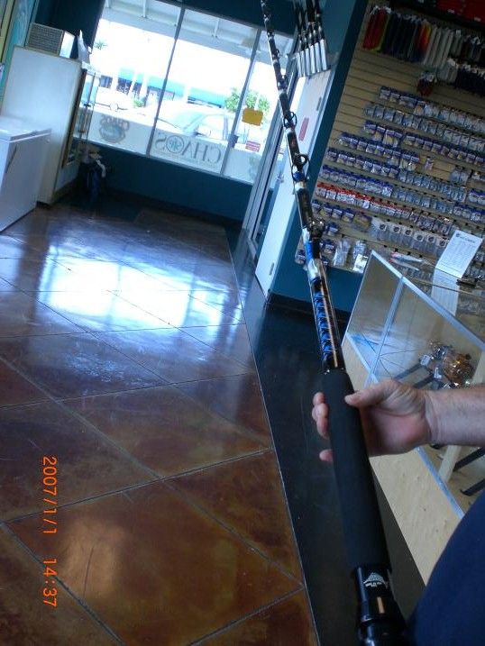 Bigger and badder then my 130 lb Gatorglass blank this new black monster can withstand any punishment any shark fisherman can throw in it's direction.Thick walled and with a huge tip this beast rod can be used with 130 ,150 or 200 lb test if you prefer,,,,,,this might be the cryptionite that kills superman -the rod that is able to defeat those 1500 pound hammers on the keys bridges.They are heavy and super strong but you better eat a good meal to handle this canon.We prefer the long rods on piers and bridges to turn the big sharks when they dive under and with this rod and superheavy line we feel we can turn just about any monster shark(Bull,Tiger or Hammer)Chaos rod has the blank and can build them with your choice of colors.Only one reelsesat in the world fits it and it's made by our friend Stuart at Stuart industries in Miami.Marshall of Chaos rods has hit a home run with this blank and quite a few guys in the shark club have had them built.
