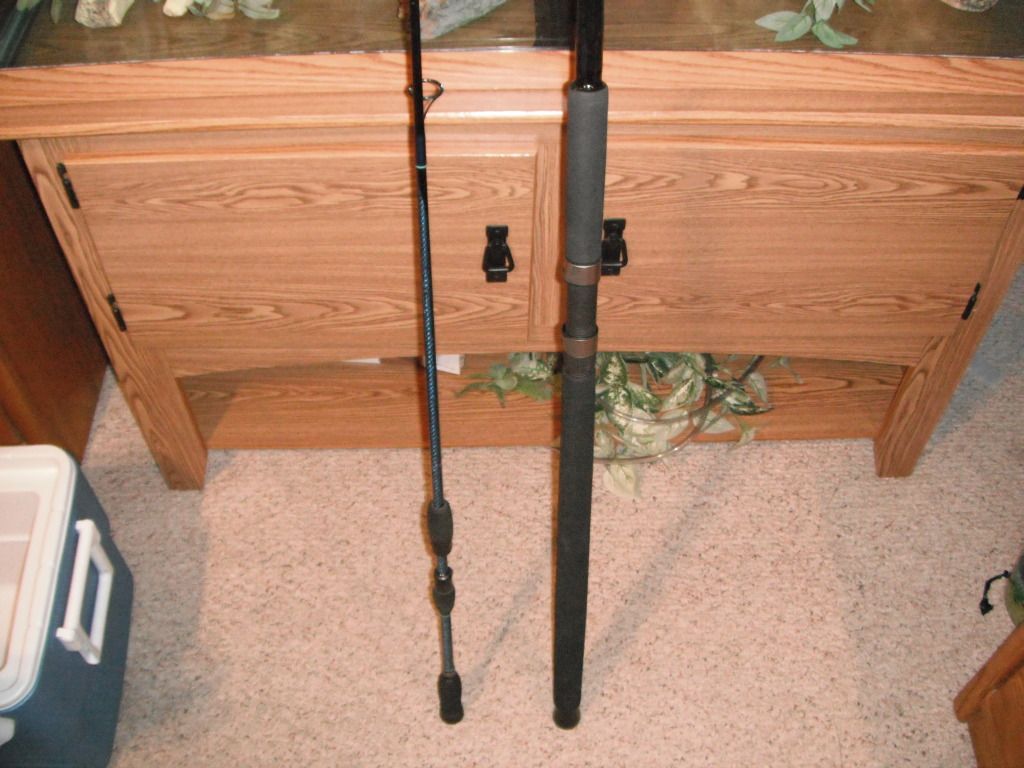 9 foot conventional key largo Rod; 20 to 40, foul proof guides and a turbo tip that is ok for use with braided lines, new foam and reel seat $80