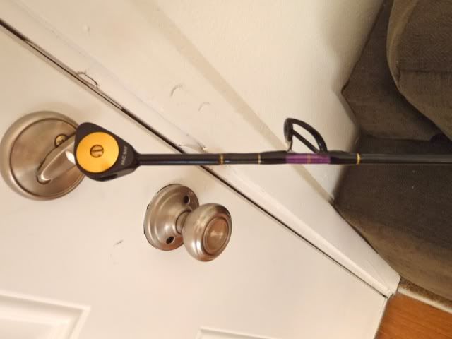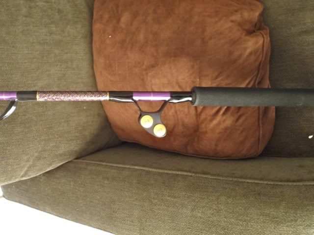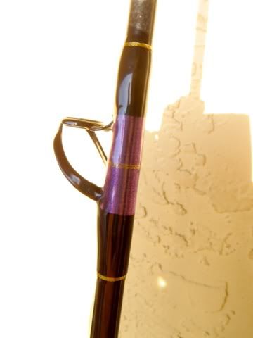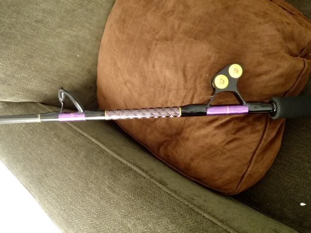 Calstar 765H cut down to 6 foot, rated 50-130 built for this reel, but would work any 30 and a 50, metallic purple with gold inlays, pac bay eliminator stripper and tip, 16 inch hypalon foregrip, 12 inch rear grip