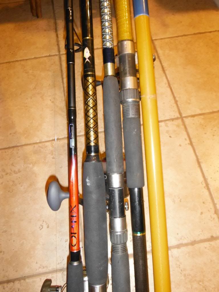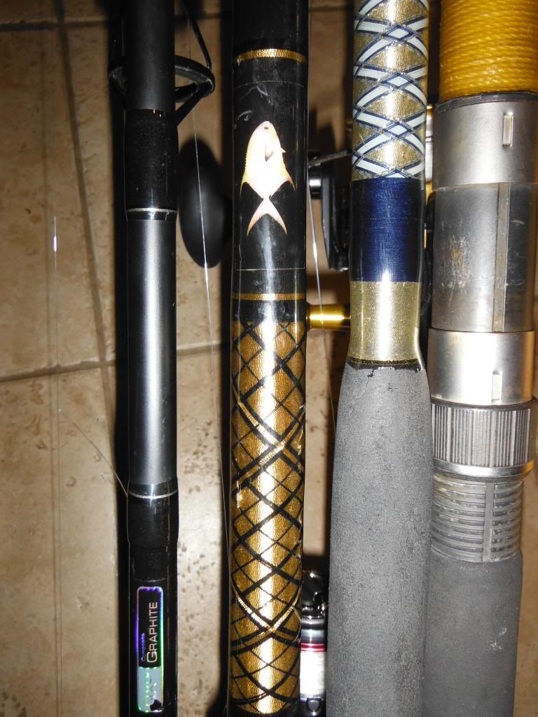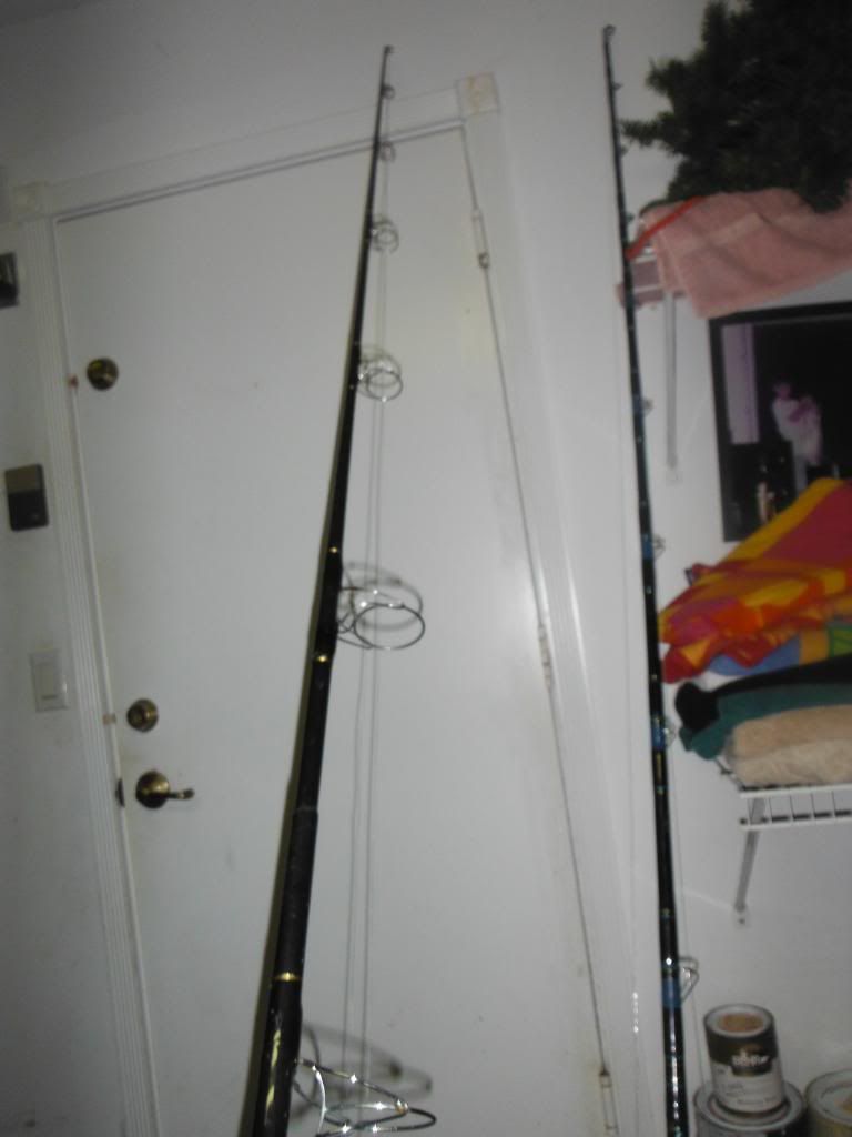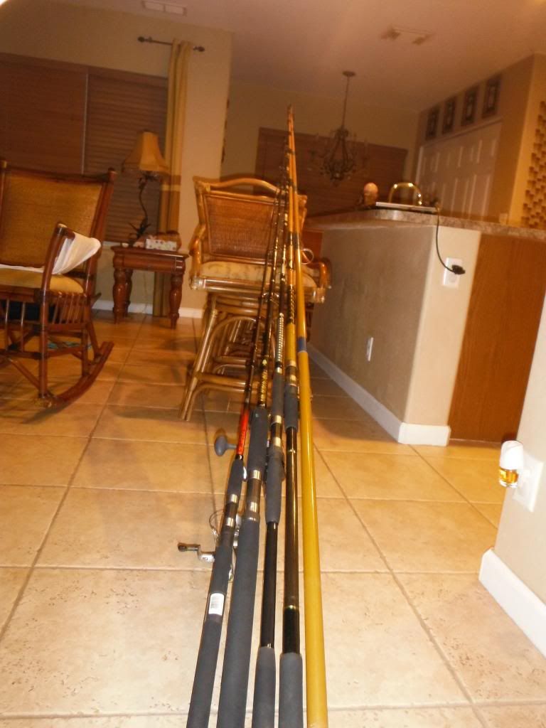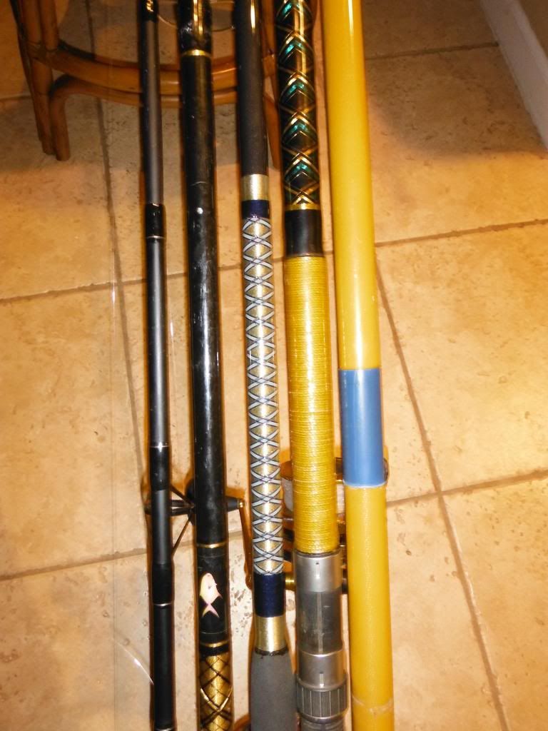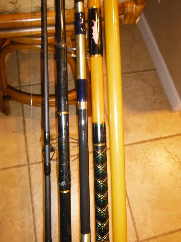 The 2nd from the right with the tarpon on it is a 13ft 4inch Lamiglas set up for a spinning reel i'm asking $150.
