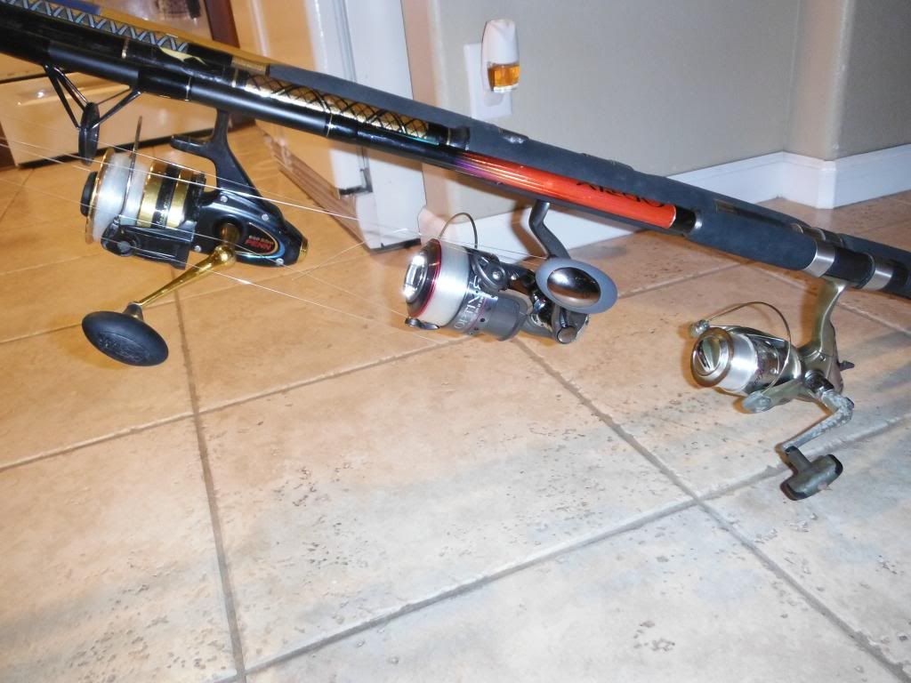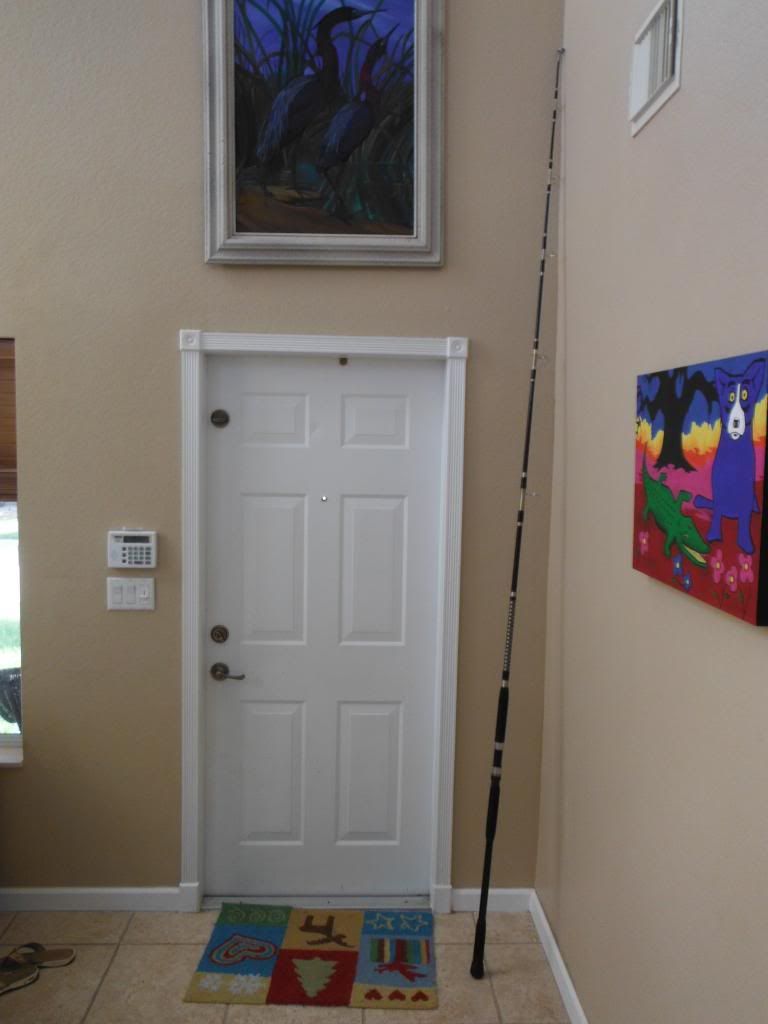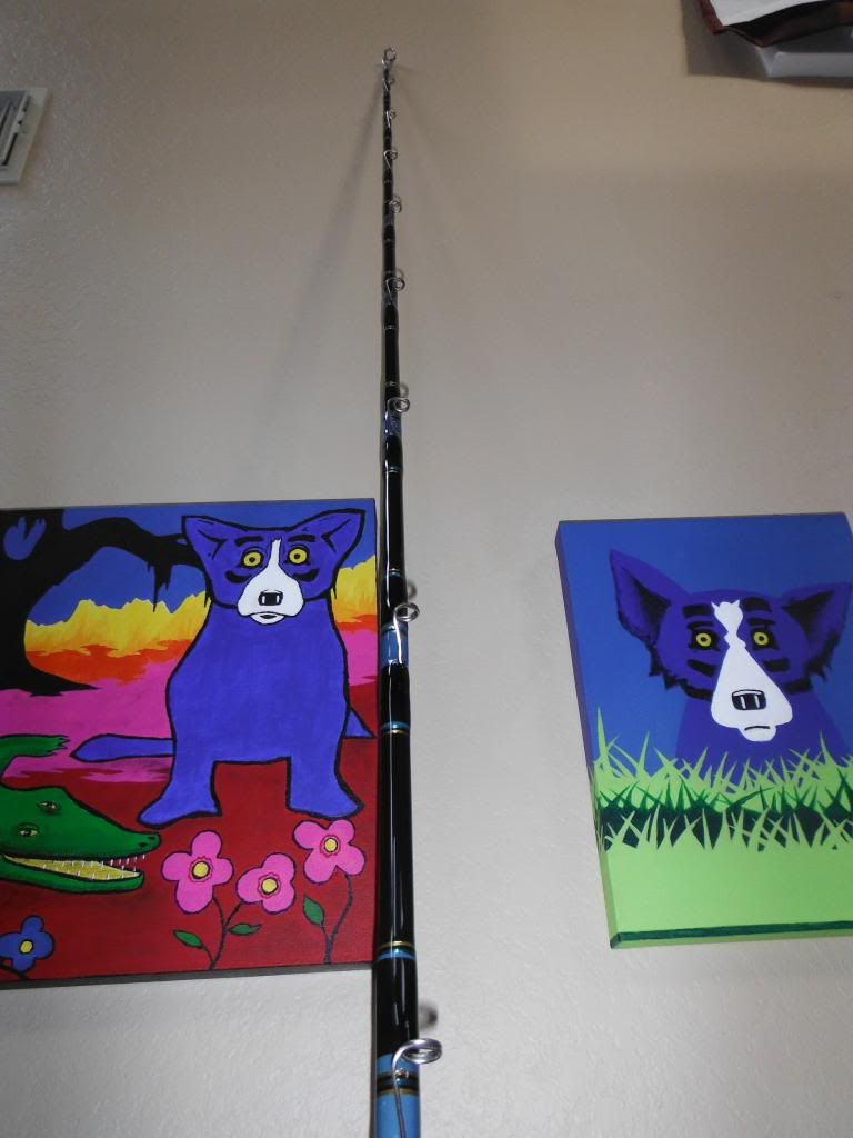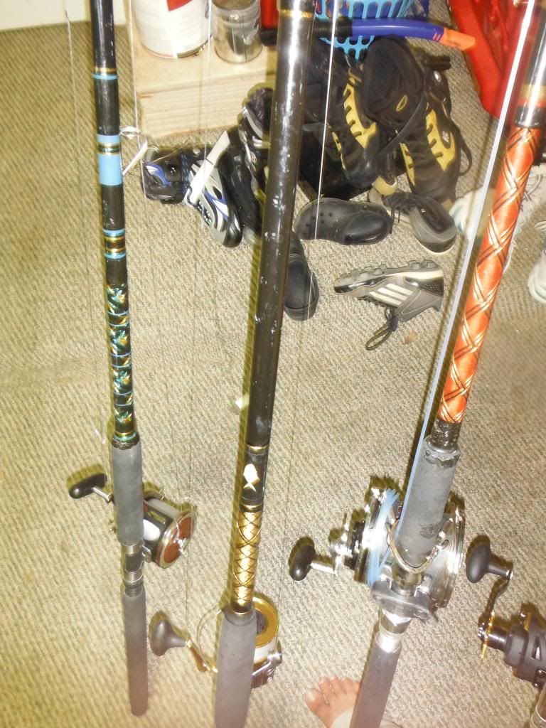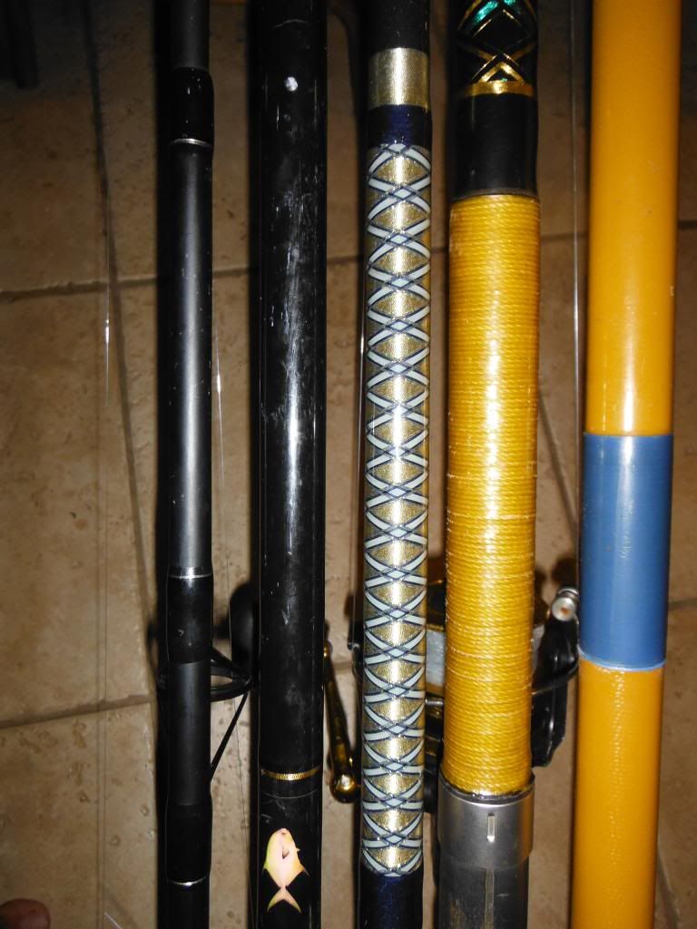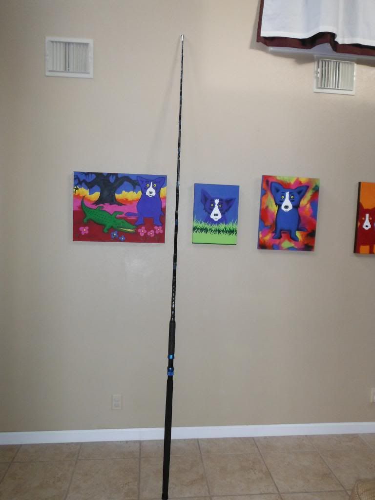 The 2nd from the right with the tarpon on it is a 13ft 4inch Lamiglas set up for a spinning reel i'm asking $150.