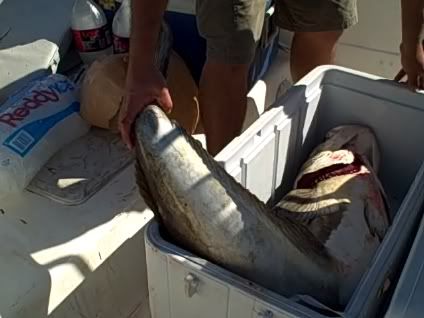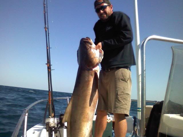 Shortly there after I drop down a big perch and immediately get hammered...it was something BIG!!! The weight like a nurse shark but with explosive runs and brut strength...what the heck is it...then finally after about 15-20mins I finally see it....COBIA!!! A big freakin cobia...he wasnt tired yet. A few more runs to the bottom and back and we finally manage to get 2 gaffs in him and on to the deck he flops...and slams...and thrashes. No broken gear or lost appendages lol