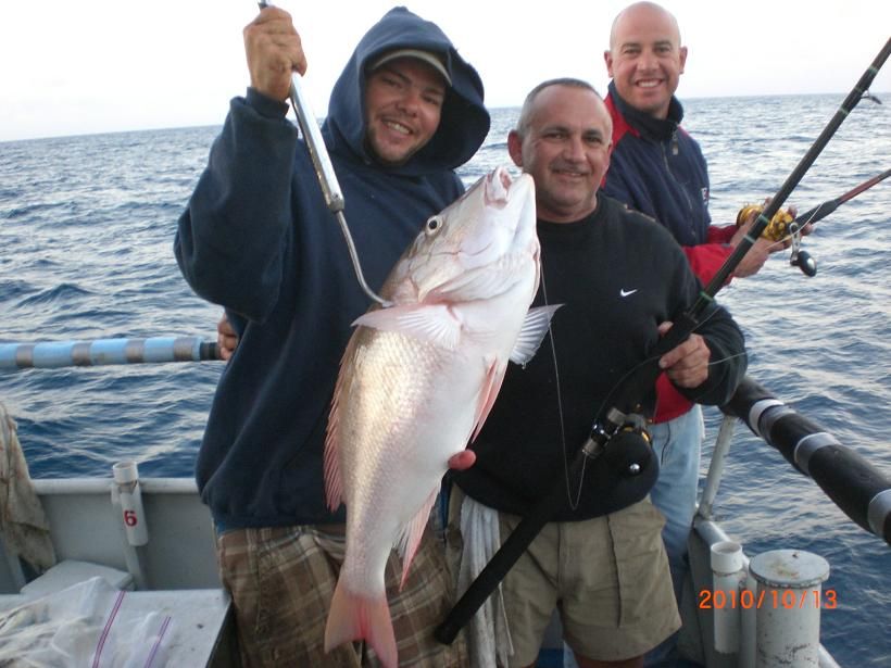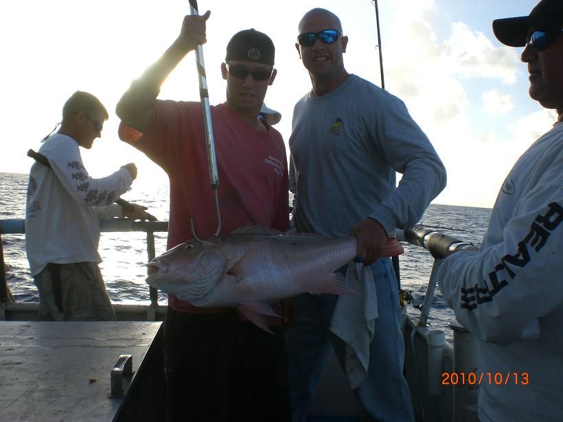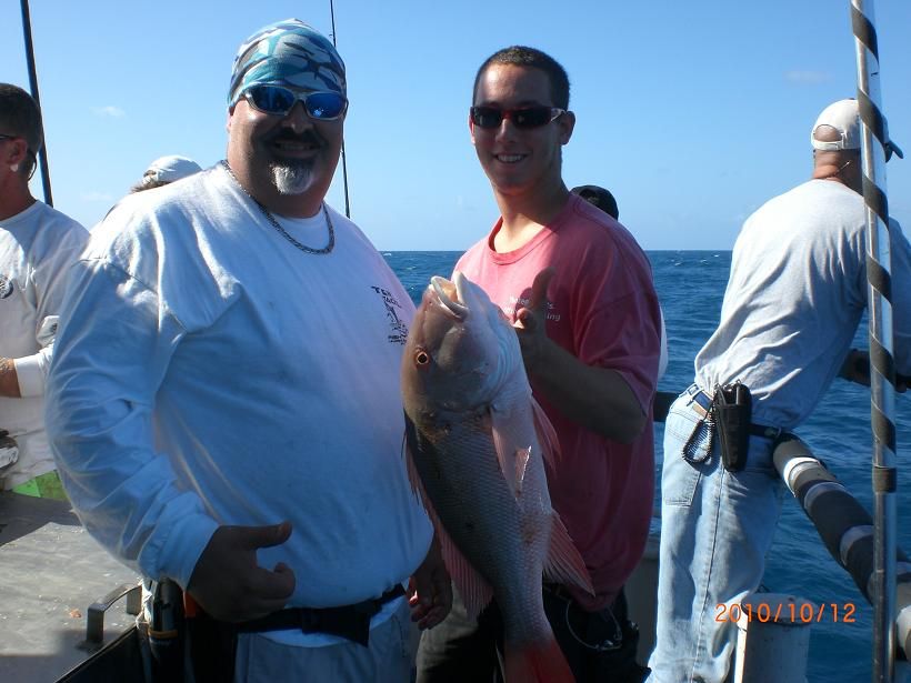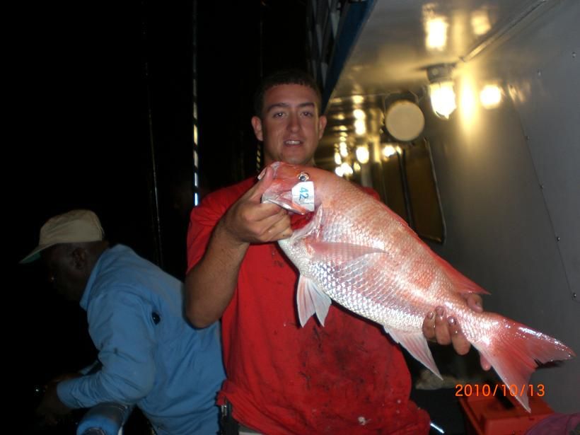 First time mate Vinny poses with a true Amereican red snapper caught by a fisherman at the bow while the boat was anchored in 180 feet of water