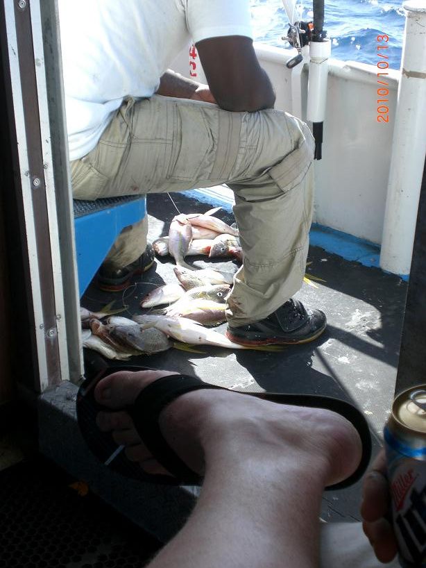 Occasionally and between spots I would walk to the stern to take pictures of the muttons and assorted big fish coming over the sides. A fat wash down hose was right where i was fishing and every time the mates washed the deck the hose was in my way ."Where them hose at"like Richard Pryor I shouted every time I wanted the hose moved out of the way,some of the black guys next to me busted out laughing when I shouted about "them hose". I also laughed my a$$ off but more then that I just wanted to catch some big fish.