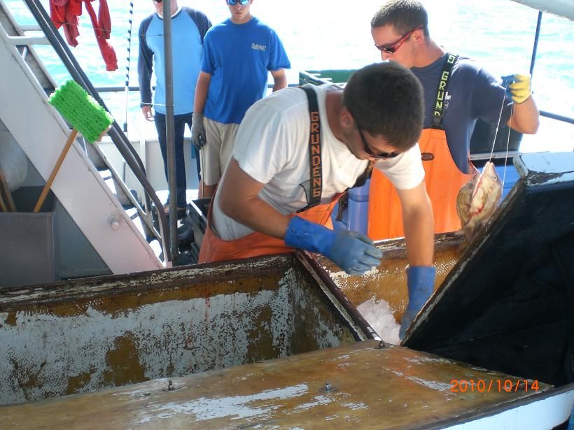 the load of quality fish is moved into vats for easy off loading at the dock