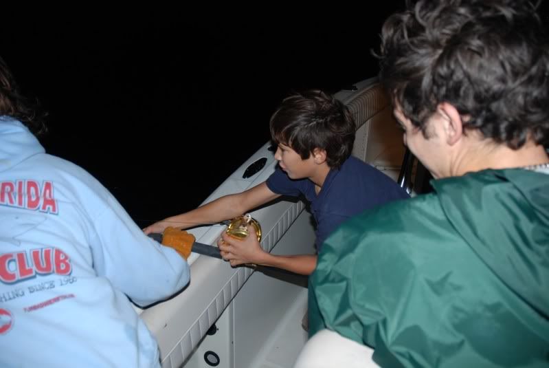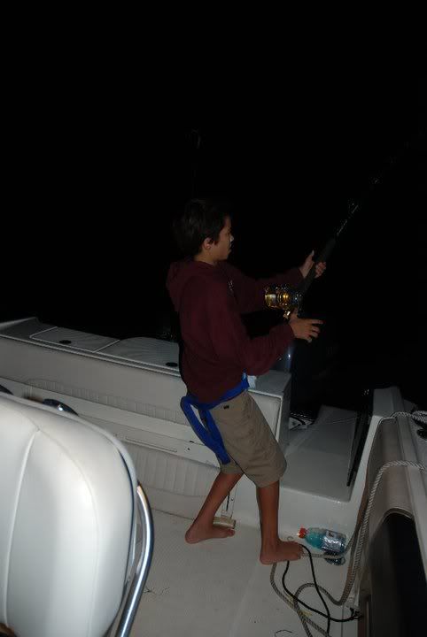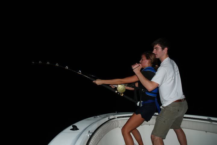 My sis fights the fish for a good half an hour and jimmy takes over... at around 10:45 I take a shift on the fish and I see the light aproaching from the darkness (which means that the fish is within 100 feet of the boat so I'm about to hand the rod over to my sis so I can get the gaff ready... WHEN THE HOOK PULLS!!!I Needless to say after fighting the fish and chasing it for over an hour.. we were pretty discouraged. I re-rig everything up.. and put it back out. At around 2am we get another hit.. its first run alone is 500 yards and brings me down to my braid. We regain on the fish chasing it everytime it reaches the braid. At 4am the fish is still not showing any signs of tiring.. WHEN THE HOOK PULLS AGAIN!!!! After an action packed night.. we are all tired.. and we head in quite discouraged.. but not denying that we had an awesome night.