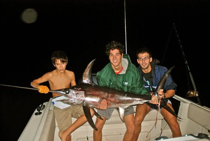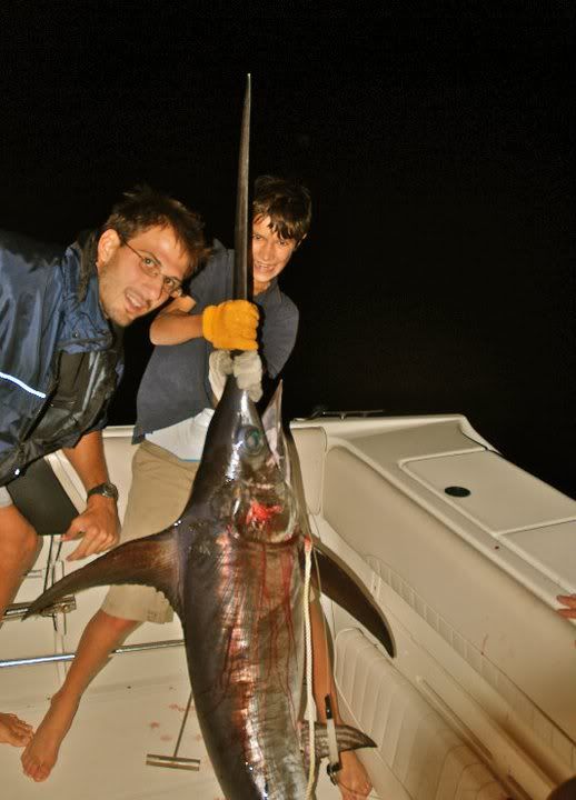 School has been intense this semester, yet I have still found some time for fishin. Since late summer I've found myself drifting over the dark waters of the gulf stream sporadically on friday nights. My last very last second but unmoving decision to go fishing sometimes do not work out for my usual fishing buddies, and I have found myself taking friends out fishing for their first time and have enjoyed teaching them and watching them enjoy the sport like I do. In my pursuit of swordfish the gladiators of the sea, I spent many a night drifting for 12 hrs without a hit. For some reason instead of discouraging me it only motivated me more to get out there and earn my swordfish. When you arent getting a hit chances are you may be doing something wrong so I did my resarch, changed my rigs up and began letting them to depth according to moon phase and time of night. I had talked to raymundo and johny the guy from and the guy from IGFA who helped me test my new fishing line and the trip was set. I called Will but he was already planning on heading to the west coast for a club gathering. Three hours before we were all starting to meet up, the calls rang in, Raymundo had to wait for someone that was late to fix something at his house, johnny had a last minute charter in the mornin and jacks boat mechanic had messed up the previous day so he had to pick up his boat a day late. I called up my sister whos usually goodluck (caught my first 300+ bull with her) and my friend jimmy from UM and they both said theyd come. We got a later start but we were out at swordfish grounds by 930. I put out three rods and I'm rigging up a squid for the 4th rod .. when ZZZZZZZZZ the third rod I had put out starts screamin drag. We get my sis hooked up in a harness and the fight is on.